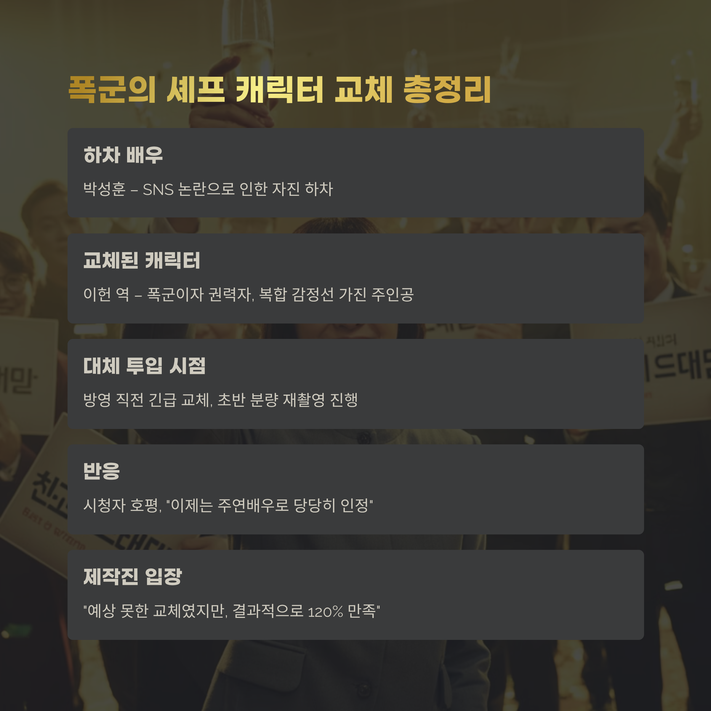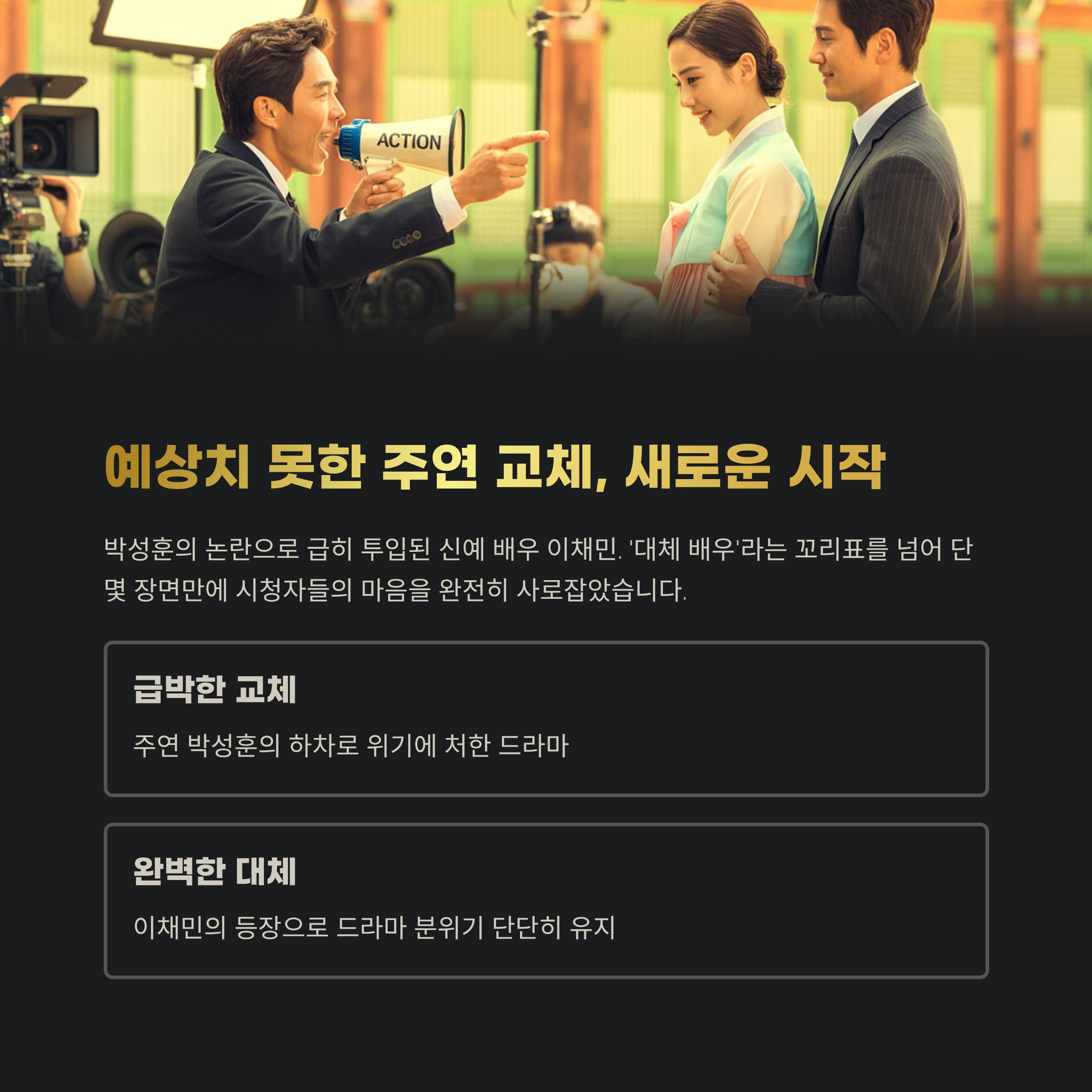 | 대체 투입 시점 | 방영 직전 긴급 교체, 초반 분량 재촬영 진행 |