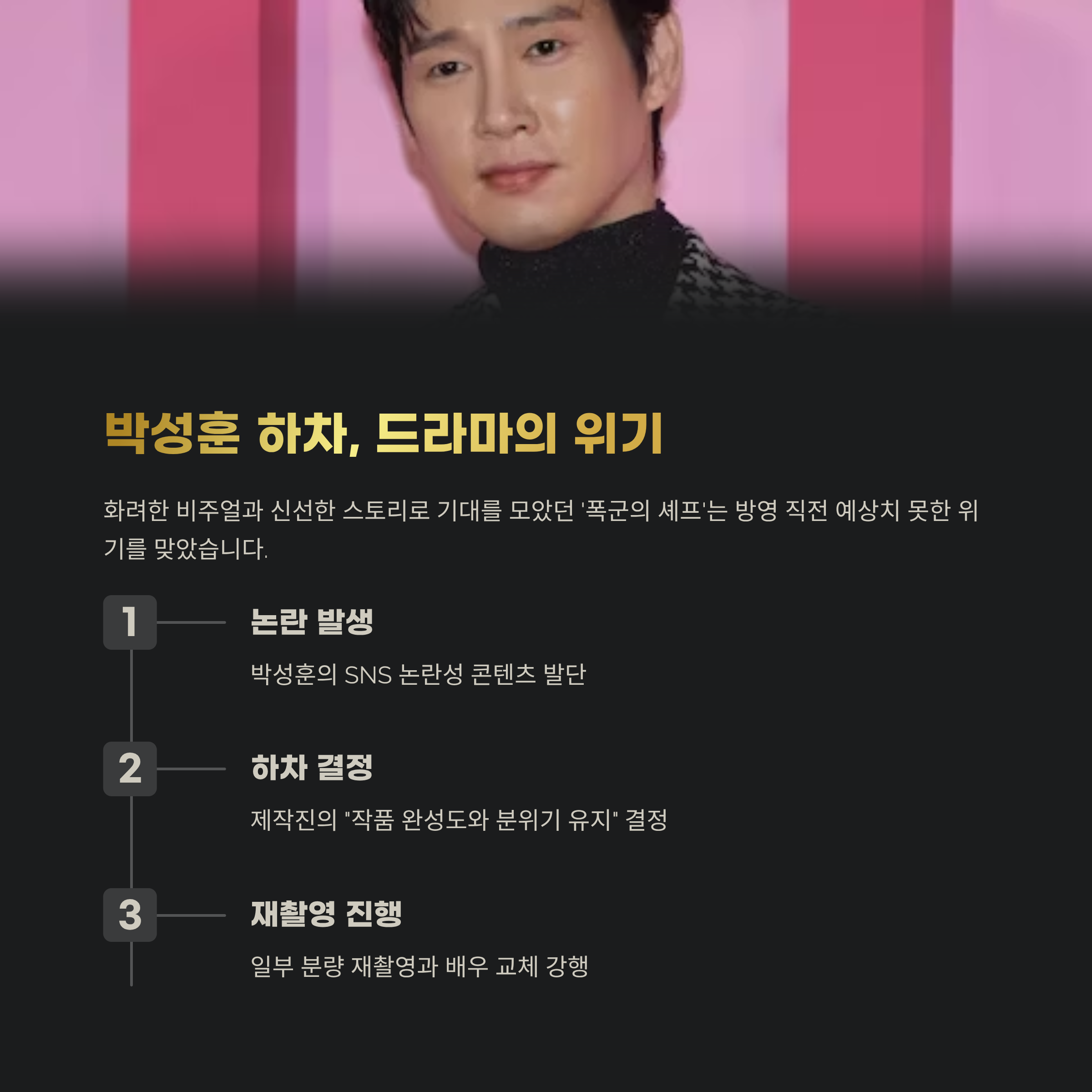 ‘폭군의 셰프’는 방영 전부터 화려한 비주얼, 신선한 스토리, 인기 웹툰 원작이라는 삼박자로 화제를 모았습니다. 하지만 초반 박성훈이 SNS에 업로드한 논란성 콘텐츠가 발단이 되어 갑작스럽게 하차를 결정하게 됩니다. 제작진은 “작품 완성도와 분위기 유지”를 이유로 밝히며, 일부 분량을 재촬영하고 배우를 교체하는 강수를 뒀습니다.