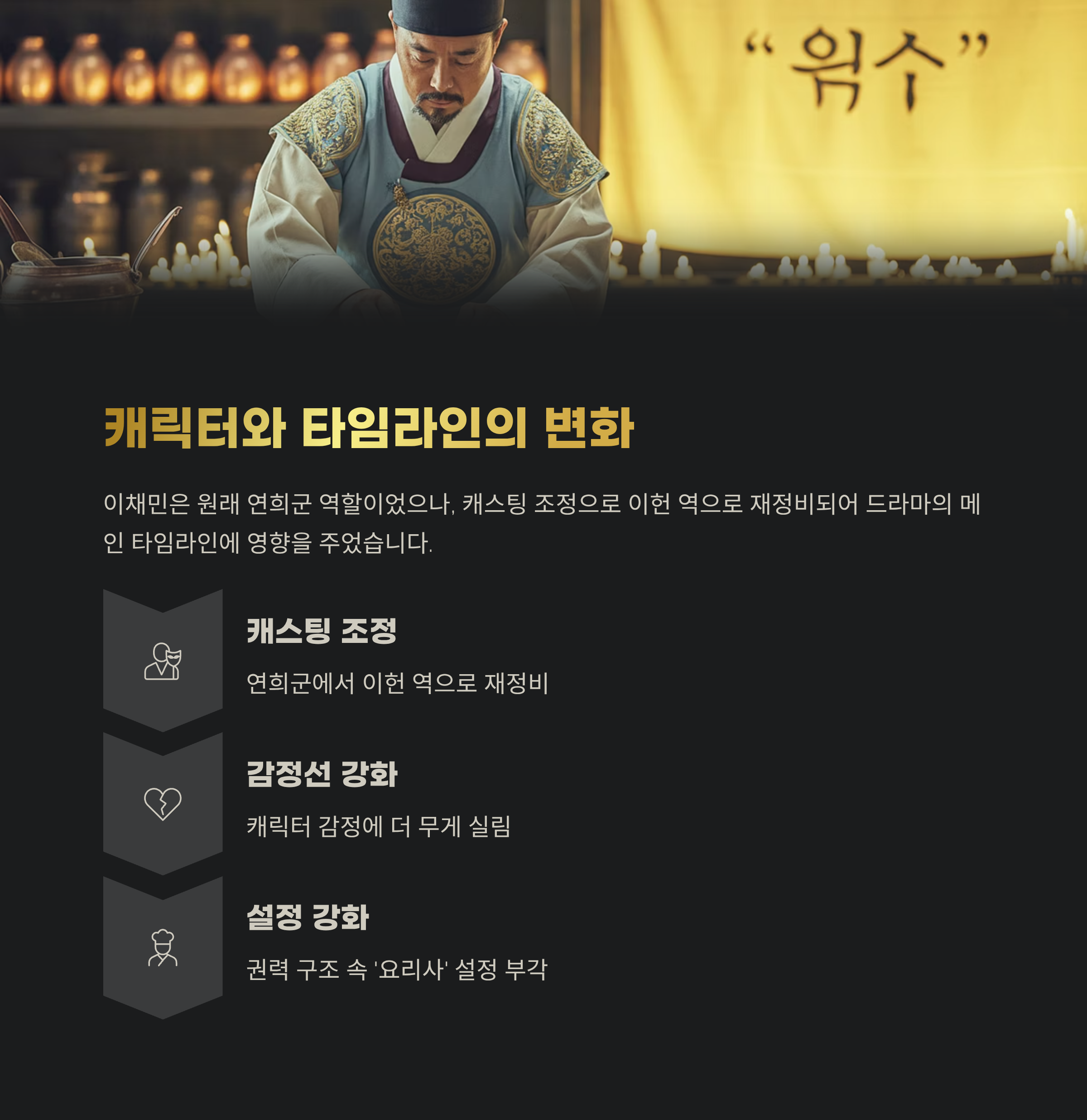 드라마 제작 초기, 연희군 캐릭터 역시 이채민이 맡았다가 캐스팅 조정이 있었고, 그 결과 현재 이채민은 연희군이 아닌 이헌 역으로 재정비되어 등장합니다. 이 변경은 드라마의 메인 타임라인에 영향을 주며 초반에 공개됐던 입궁식 스페셜 영상과 연결되기도 합니다.