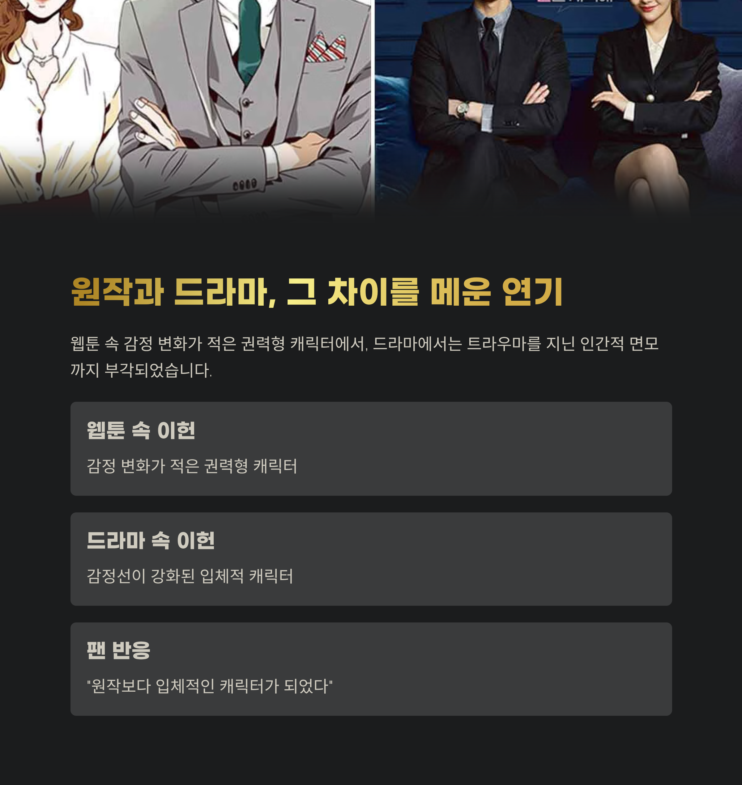 웹툰 원작에서 ‘이헌’은 감정 변화가 상대적으로 적은 권력형 캐릭터로 등장하지만, 드라마에서는 배우 교체 이후 감정선이 강화되었습니다. 특히 권력자이자 트라우마를 지닌 인간적인 면모까지 부각되면서, 원작 팬들 사이에서도 “원작보다 입체적인 캐릭터가 되었다”는 반응이 많습니다.