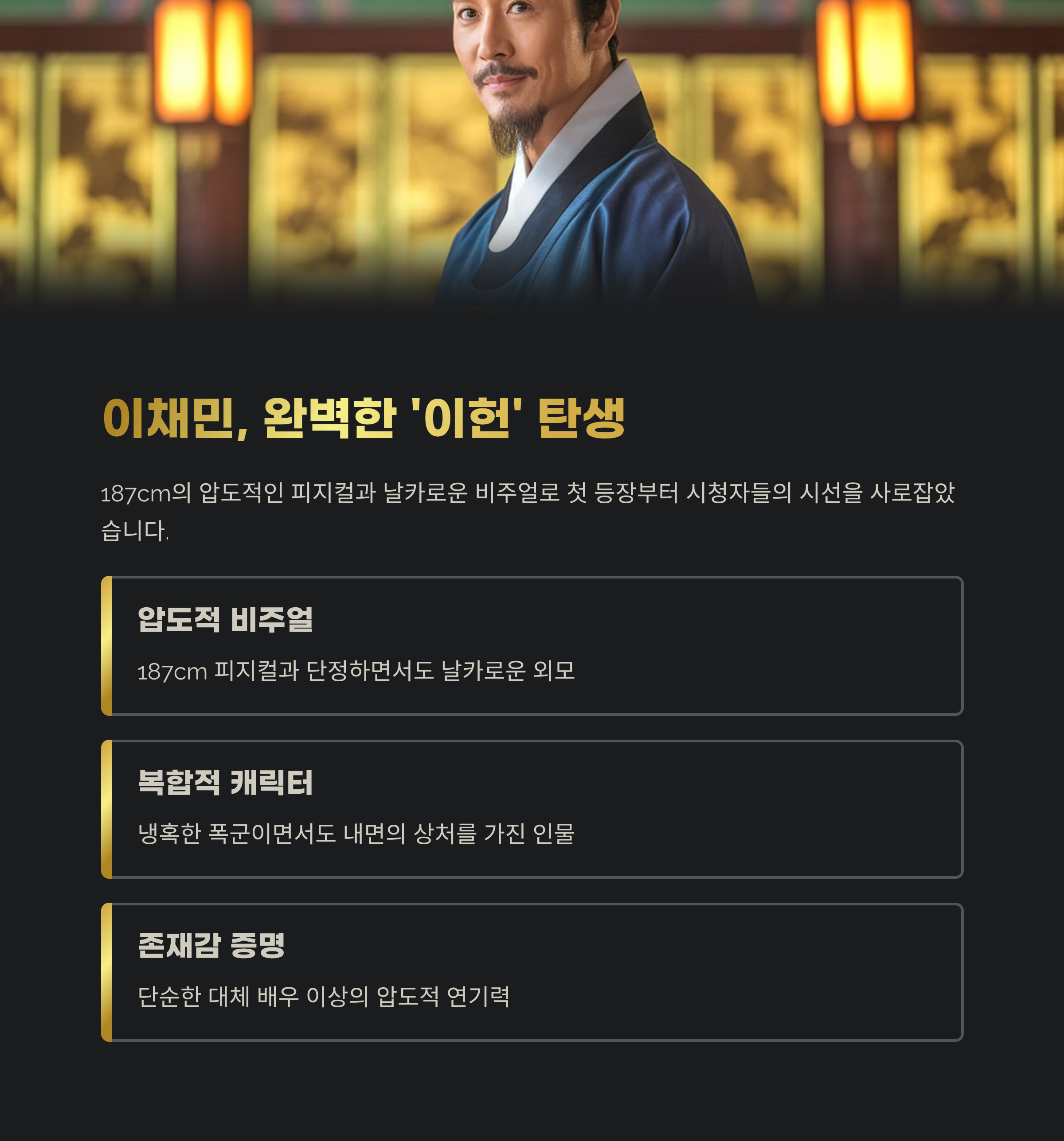 박성훈을 대신해 주인공 ‘이헌’ 역에 투입된 인물은 바로 신예 이채민. 187cm의 피지컬과 단정하면서도 날카로운 비주얼, 그리고 첫 등장부터 압도적인 몰입감을 자아내며 단숨에 이목을 집중시켰습니다. 냉혹한 폭군이면서도 내면의 균열과 상처를 가진 복합적인 인물 ‘이헌’을 섬세하게 풀어내며 단순한 대체 배우 이상의 존재감을 증명했습니다.