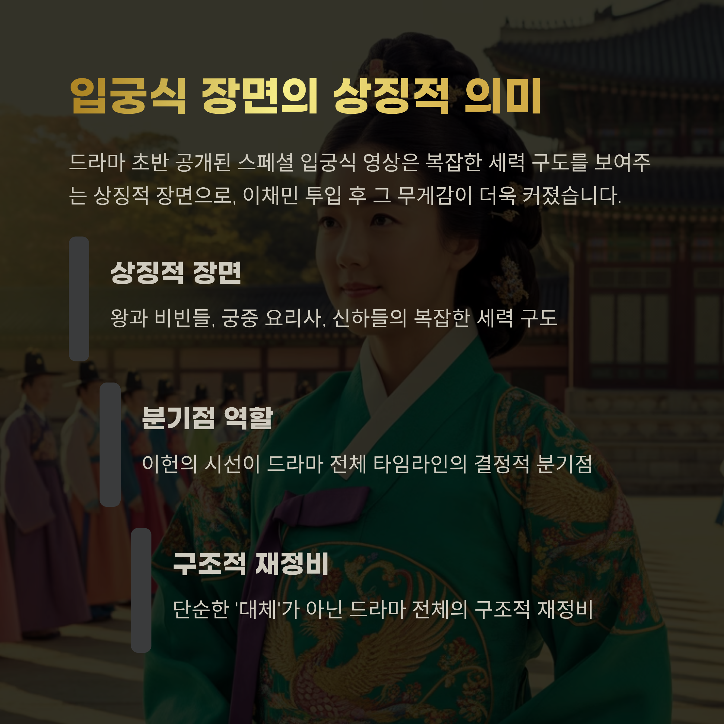 드라마 초반 공개된 스페셜 입궁식 영상은 왕과 비빈들, 궁중 요리사, 신하들의 세력 구도가 복잡하게 얽힌 상징적인 장면이었습니다. 이 장면에서 주인공 이헌의 시선이 드라마 전체의 타임라인을 결정짓는 분기점으로 기능합니다.