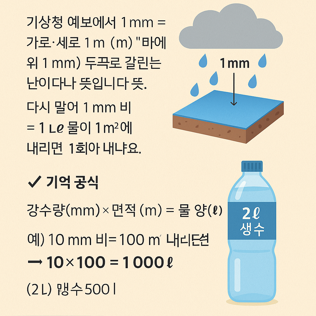 예) 10 mm 비가 100 ㎡ 마당에 내리면 → 10 × 100 = 1 000 ℓ (2 L 생수 500병 분량)