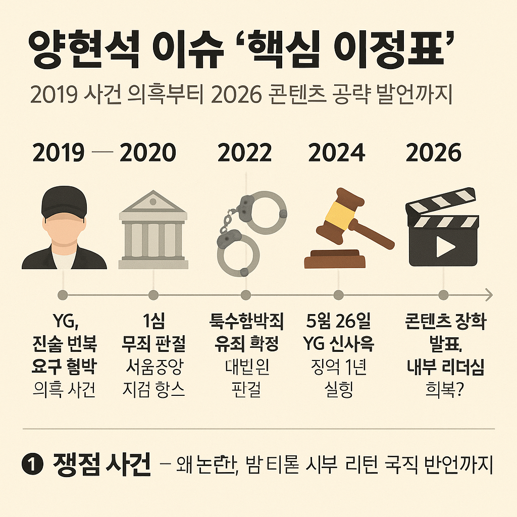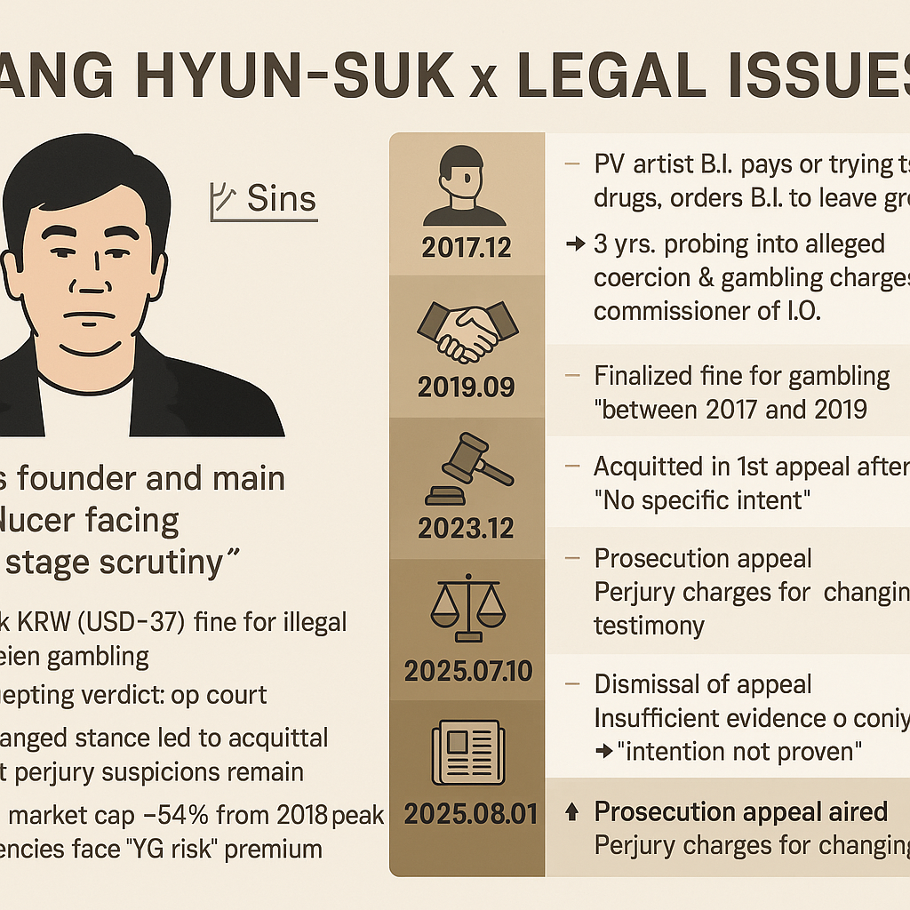 빅뱅·블랙핑크를 키워낸 양현석(YG 엔터테인먼트 총괄 프로듀서)은 K-팝 1세대 아이콘이자, 2019년 이후 줄잇는 법정 리스크의 상징이기도 하다. 이번 7월 18일, 대법원의 판단에 해당하는 최종 ‘집행유예 확정’ 소식까지 겹치며 그의 이름은 다시 K-팝 뉴스를 점령했다. 이 글은 2019년 첫 주가 폭락을 불렀던 성매매 알선 의혹부터 2025년 최종 verdict(유죄 일부 인정)까지 주식·재판·여론을 타임라인으로 정리하고, YG 엔터테인먼트의 실질적 타격을 살핀다.