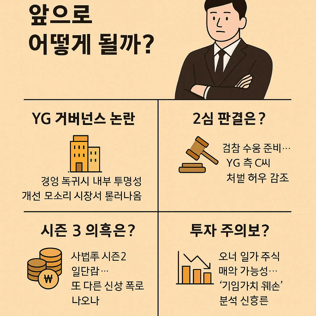 양현석의 잇단 논란은 회사를 망가뜨리지 않았지만, 지배구조 리스크 라는 꼬리표를 남겼다. K-팝 4대 기획사 모두가 오너 리스크를 겪고 있는 지금, 투자자와 팬덤은 “콘텐츠 경쟁력 + 투명 경영 시스템” 두 가지를 동시에 요구한다.