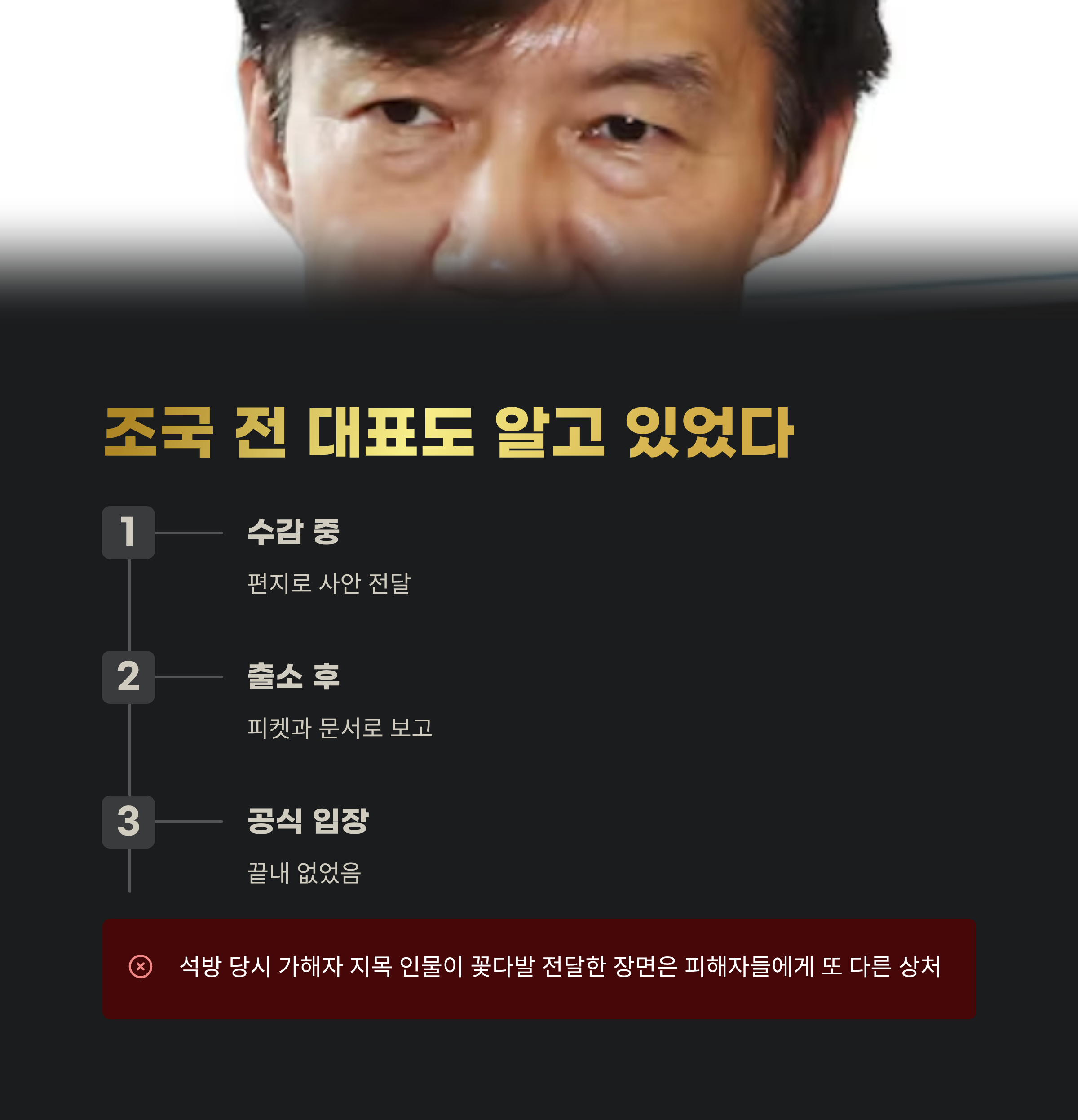 특히 조국 전 대표 석방 당시, 가해자로 지목된 인물이 꽃다발을 전달한 장면은 피해자들에게 또 다른 상처였다고 말했습니다.