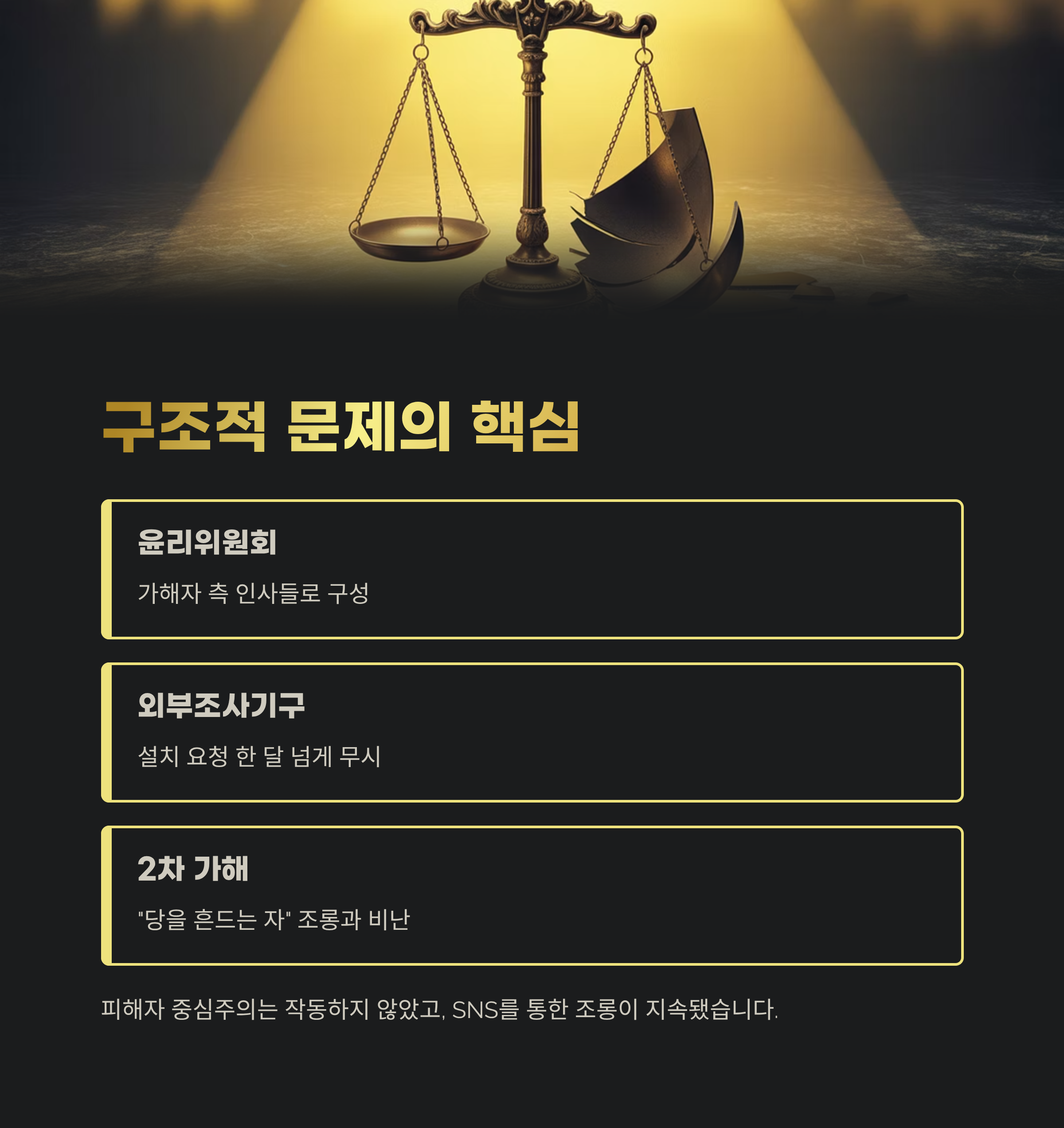 강미정 전 대변인은 윤리위·인사위가 ‘가해자 측 인사들’로 채워져 있었다고 폭로했습니다. 외부 독립조사기구 설치 요청은 한 달 넘게 무시됐고, 결국 공정한 징계는 기대할 수 없는 구조였다는 겁니다.
