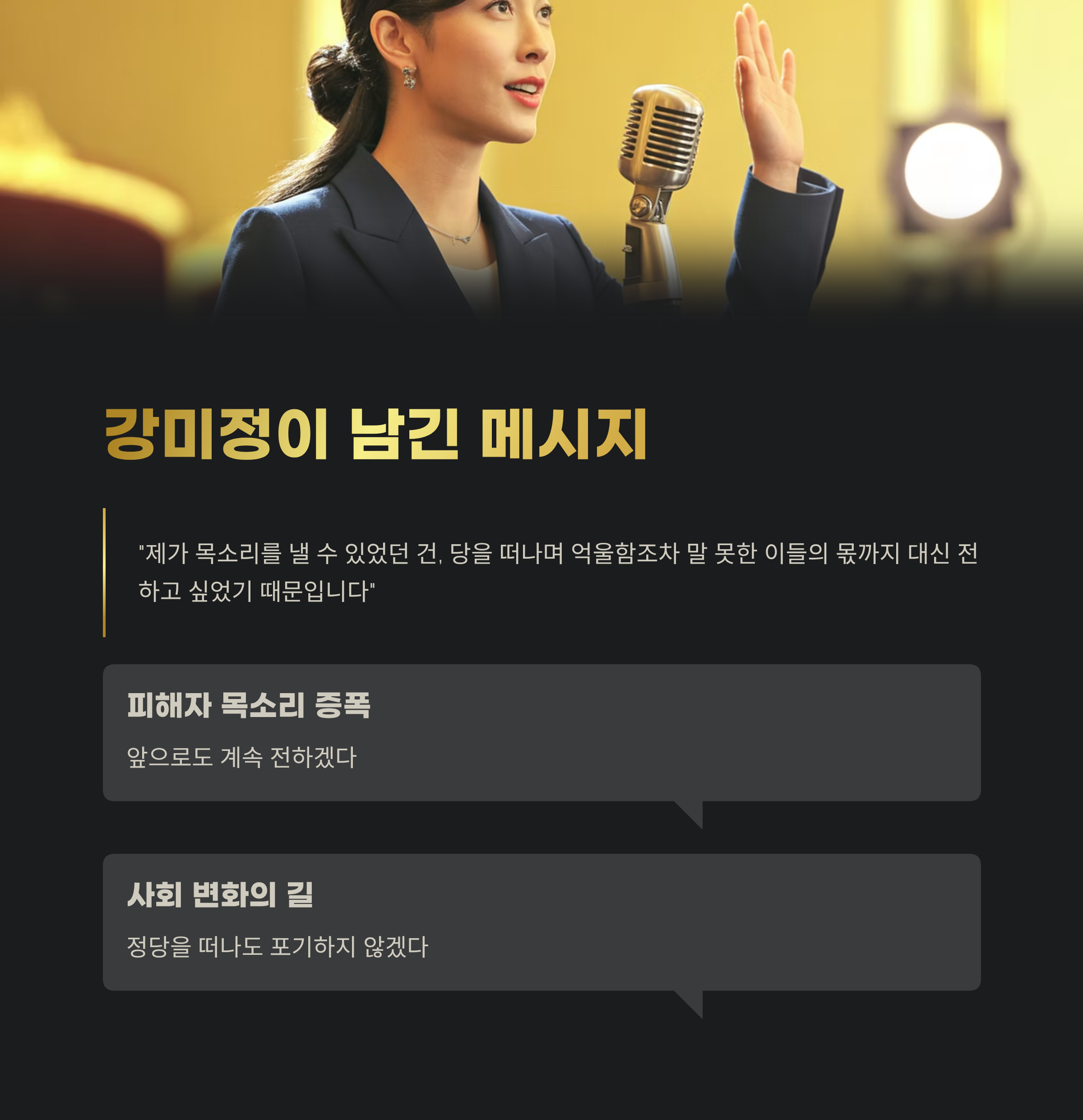 결국, 강미정 대변인의 탈당은 정의 실현보다 조직 보호에 급급한 정당 구조에 대한 최종적 이탈 선언이었습니다. 그녀는 당 지도부가 피해자들의 절규를 외면했고, 조력자를 징계했다며 분노를 표했습니다.