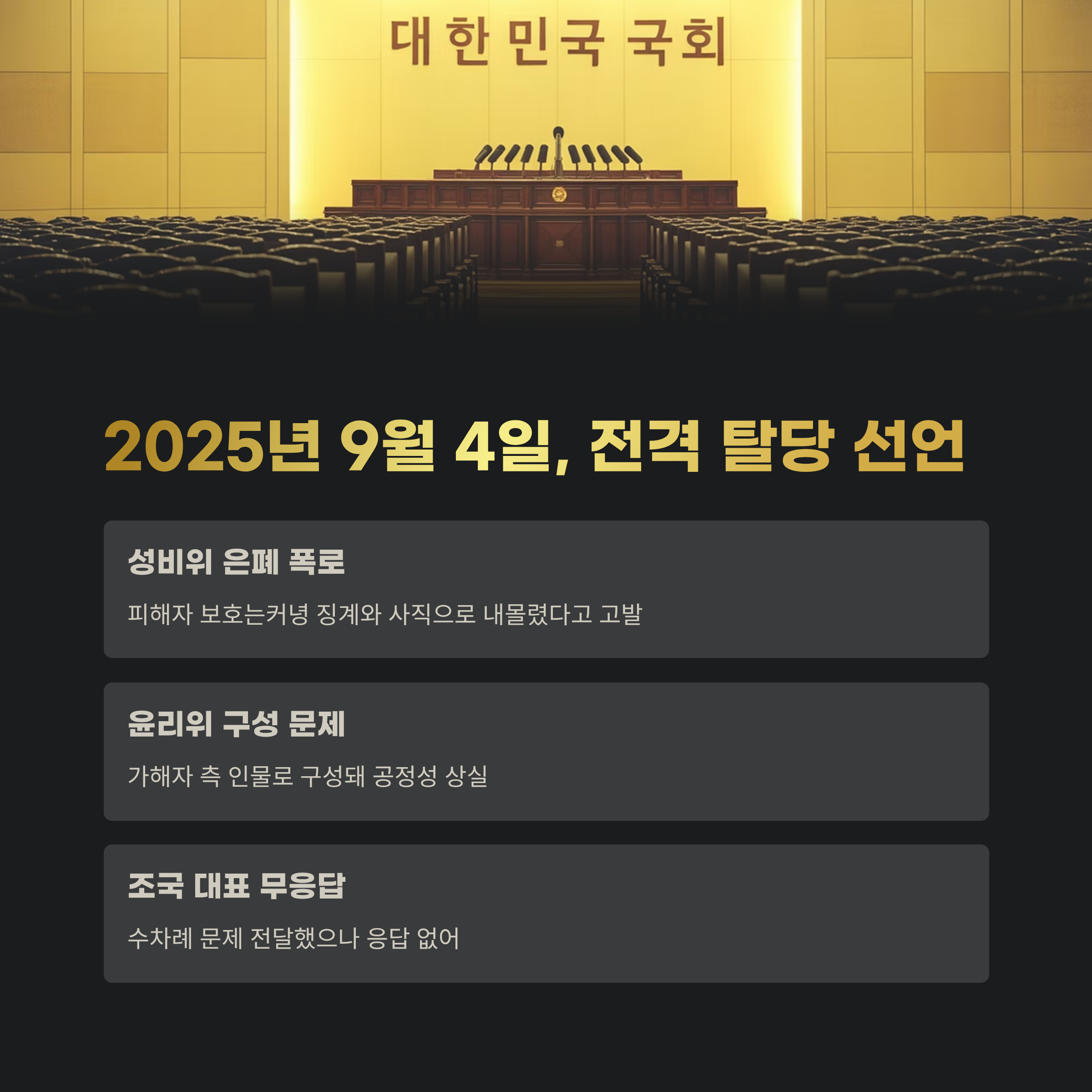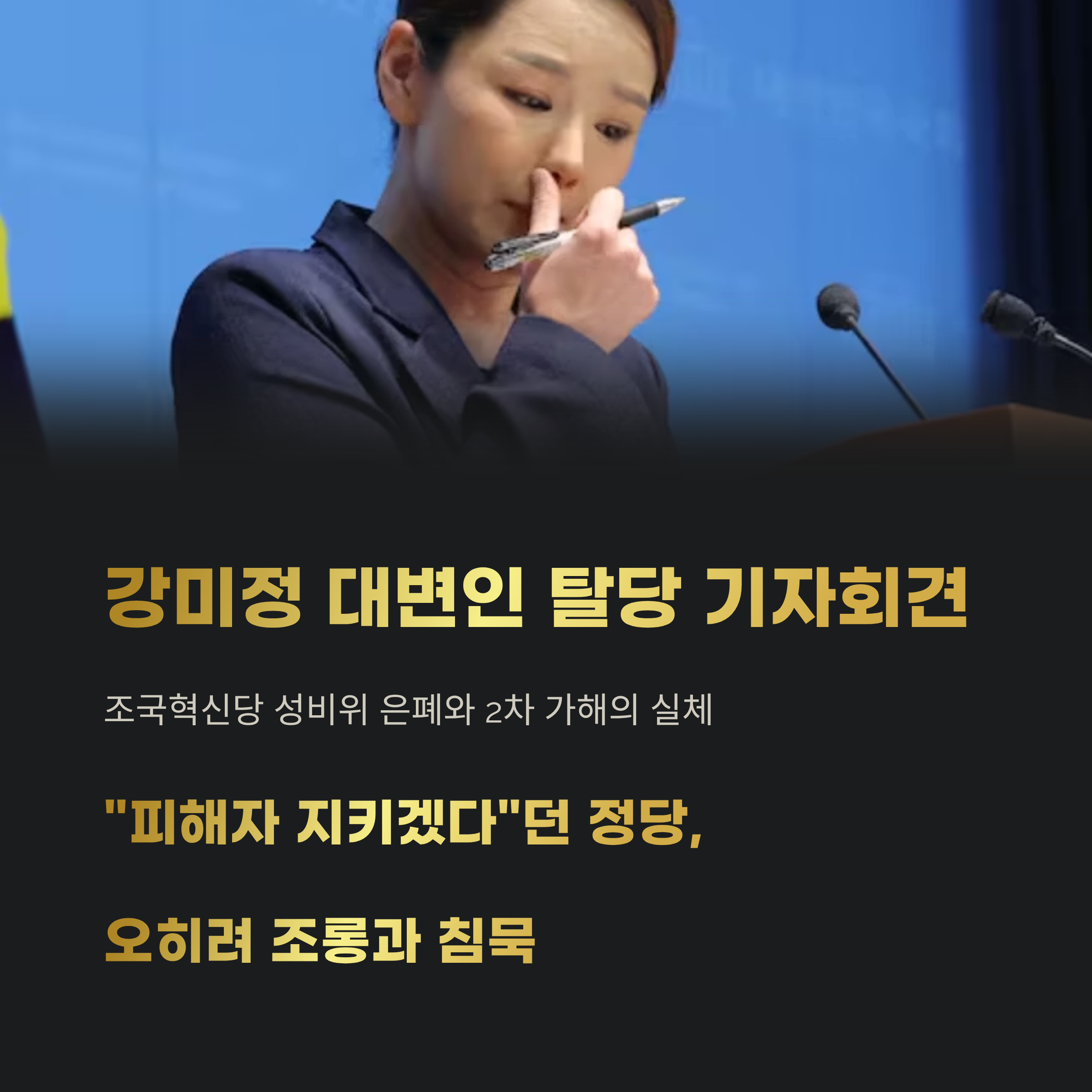 2025년 9월 4일, 강미정 조국혁신당 대변인이 국회 소통관에서 전격 탈당을 선언하며 당 내부 성비위 사건의 은폐와 2차 가해 실태를 폭로했습니다. 그녀는 기자회견을 통해 피해자 보호는커녕, 피해자와 조력자가 징계와 사직으로 내몰렸다고 고발했습니다. 윤리위와 인사위가 가해자 측 인물로 구성돼 공정성을 상실했고, 조국 전 대표에게도 수차례 문제를 전달했으나 응답은 없었다고 밝혔습니다. 정치권 전반에 경종을 울리는 이번 폭로는 ‘정당’이라는 이름 뒤에 숨겨진 권력형 침묵 구조를 다시금 조명하고 있습니다.