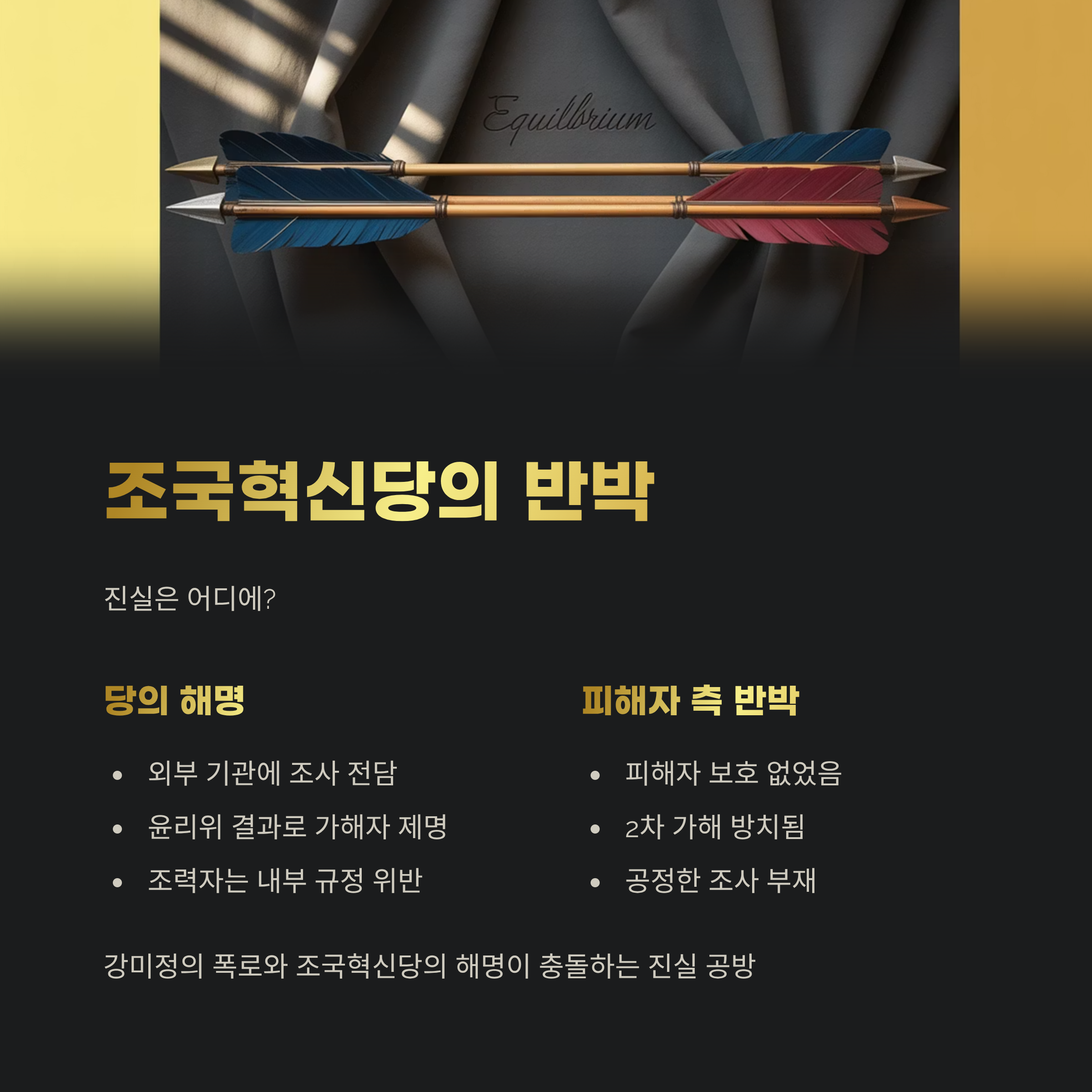 당은 모든 절차가 마무리됐다는 입장이지만, 피해자 측은 “피해자 보호는 없었고 2차 가해가 방치됐다”고 반박합니다. 지금은 강미정의 폭로와 조국혁신당의 해명이 충돌하는 진실 공방의 시기입니다.