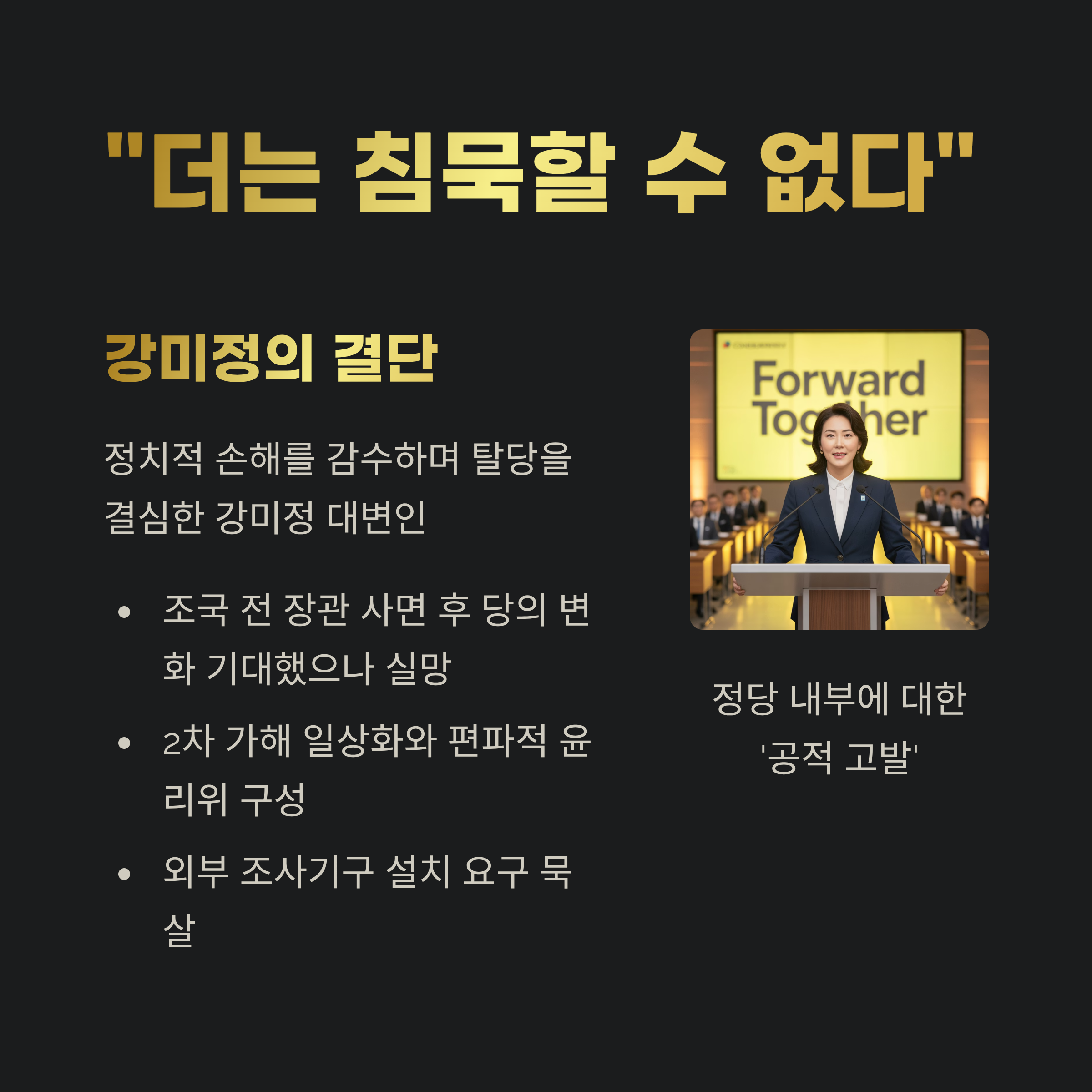 강미정은 정치적 손해를 감수하면서도 "더는 침묵할 수 없다"고 말하며 탈당을 결심했습니다.