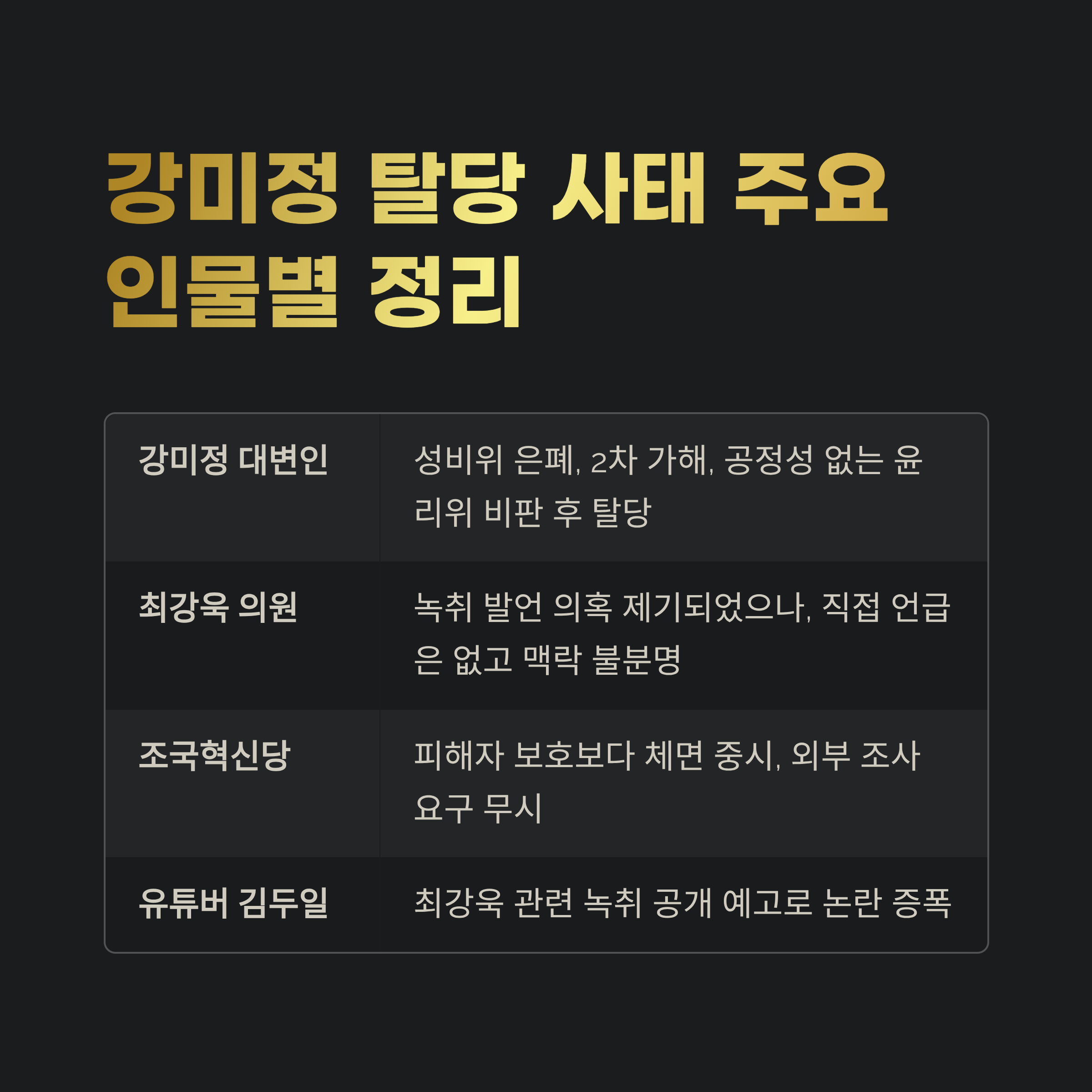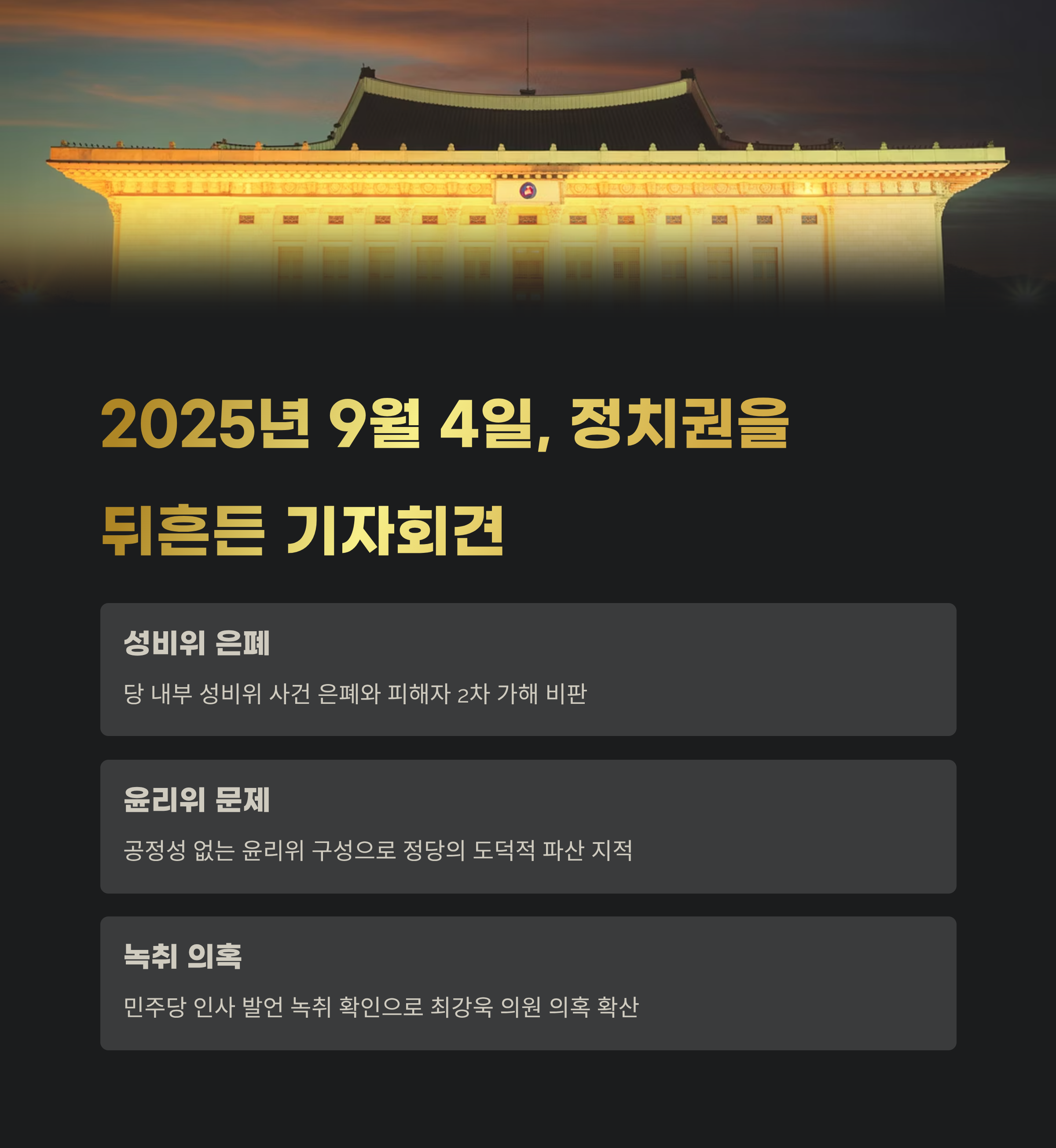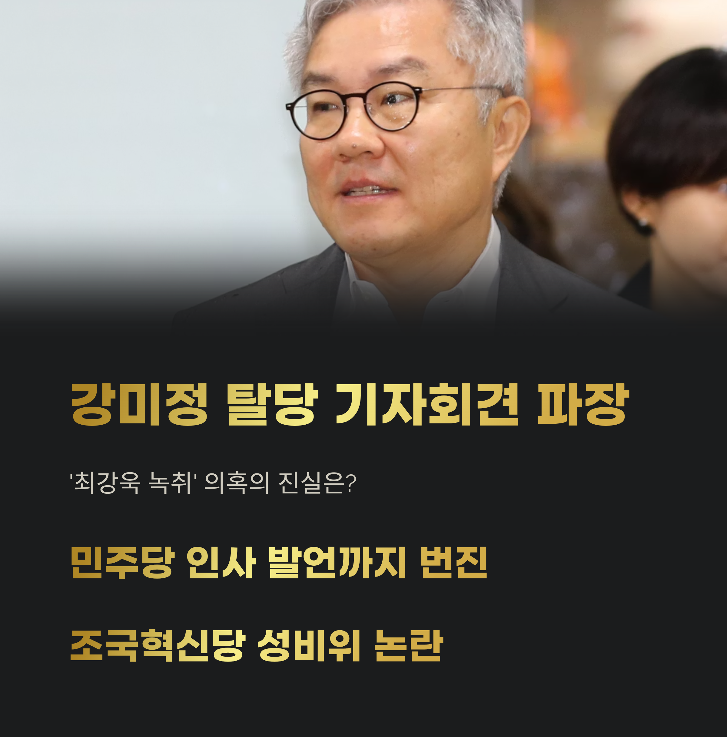 2025년 9월 4일, 강미정 조국혁신당 대변인의 탈당 기자회견은 단순한 당적 이탈이 아닌, 정치권 전체를 흔드는 사건으로 번졌습니다. 기자회견에서 강미정은 당 내부의 성비위 은폐, 피해자에 대한 2차 가해, 공정성 없는 윤리위 구성 등을 강하게 비판하며 정당의 도덕적 파산을 지적했습니다. 특히 “민주당 인사의 발언을 녹취로 확인했다”는 언급은, 최강욱 의원과 관련된 의혹으로까지 확산되며 정치권 전체에 파장을 일으키고 있습니다.