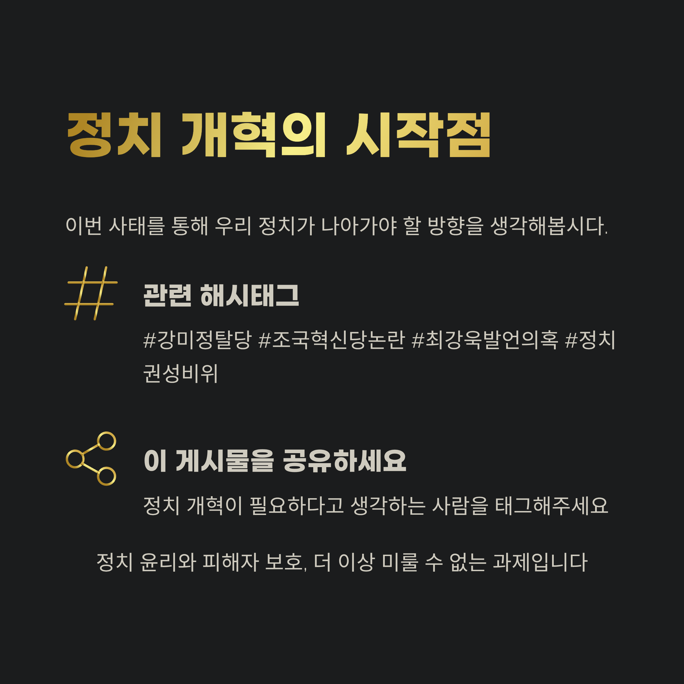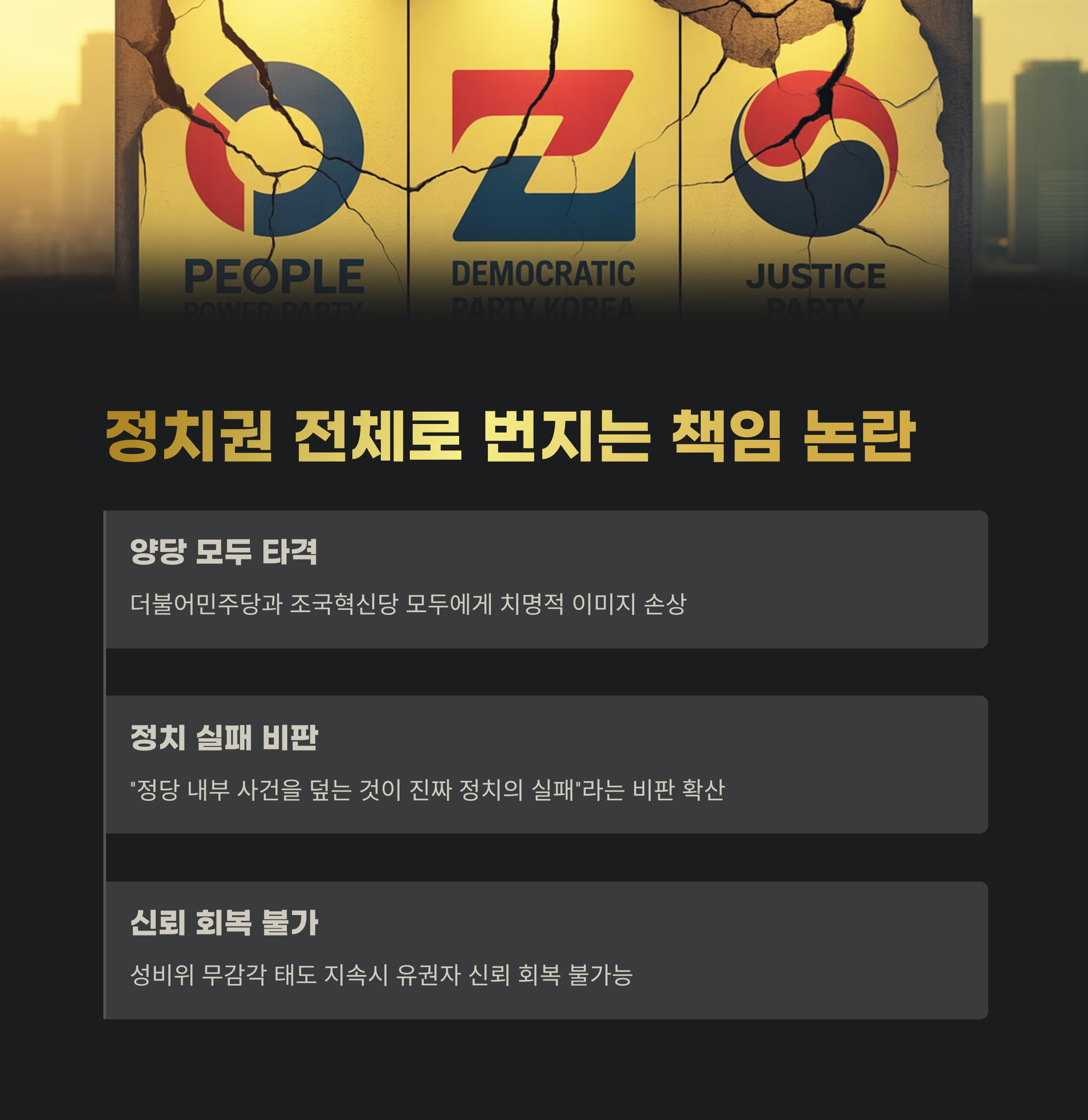 정치권 전반에서 “정당 내부 사건을 덮는 것이 진짜 정치의 실패”라는 비판이 거세지고 있으며, 성비위에 대한 무감각한 태도가 지속된다면 유권자 신뢰 회복은 불가능하다는 경고가 나오고 있습니다.