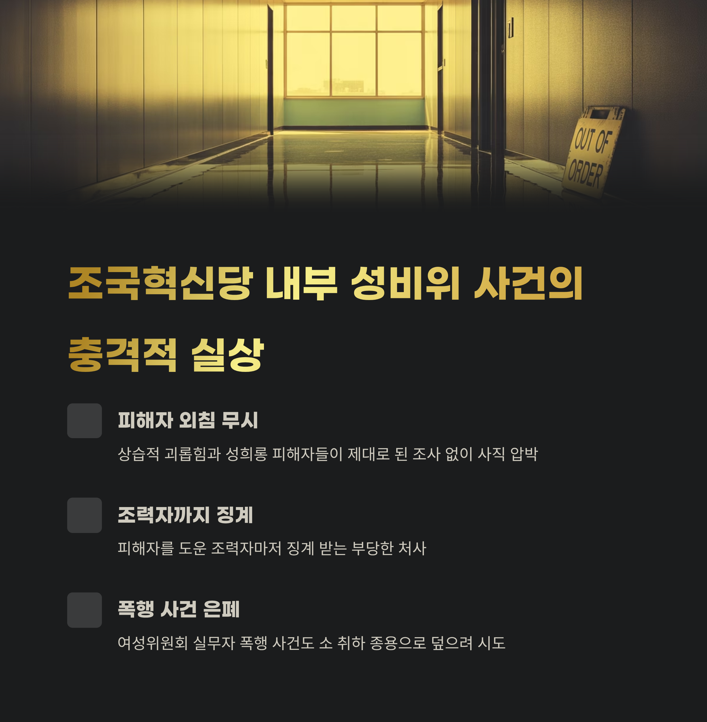 피해자들은 상습적인 괴롭힘과 성희롱을 당했음에도 제대로 된 조사 없이 사직 압박을 받았고, 도움을 준 조력자마저 징계를 받아야 했습니다. 심지어 여성위원회 실무자가 폭행을 당했음에도 당 내부에서 소 취하를 종용받았다는 사실까지 공개되며, 당의 신뢰는 뿌리부터 흔들렸습니다.