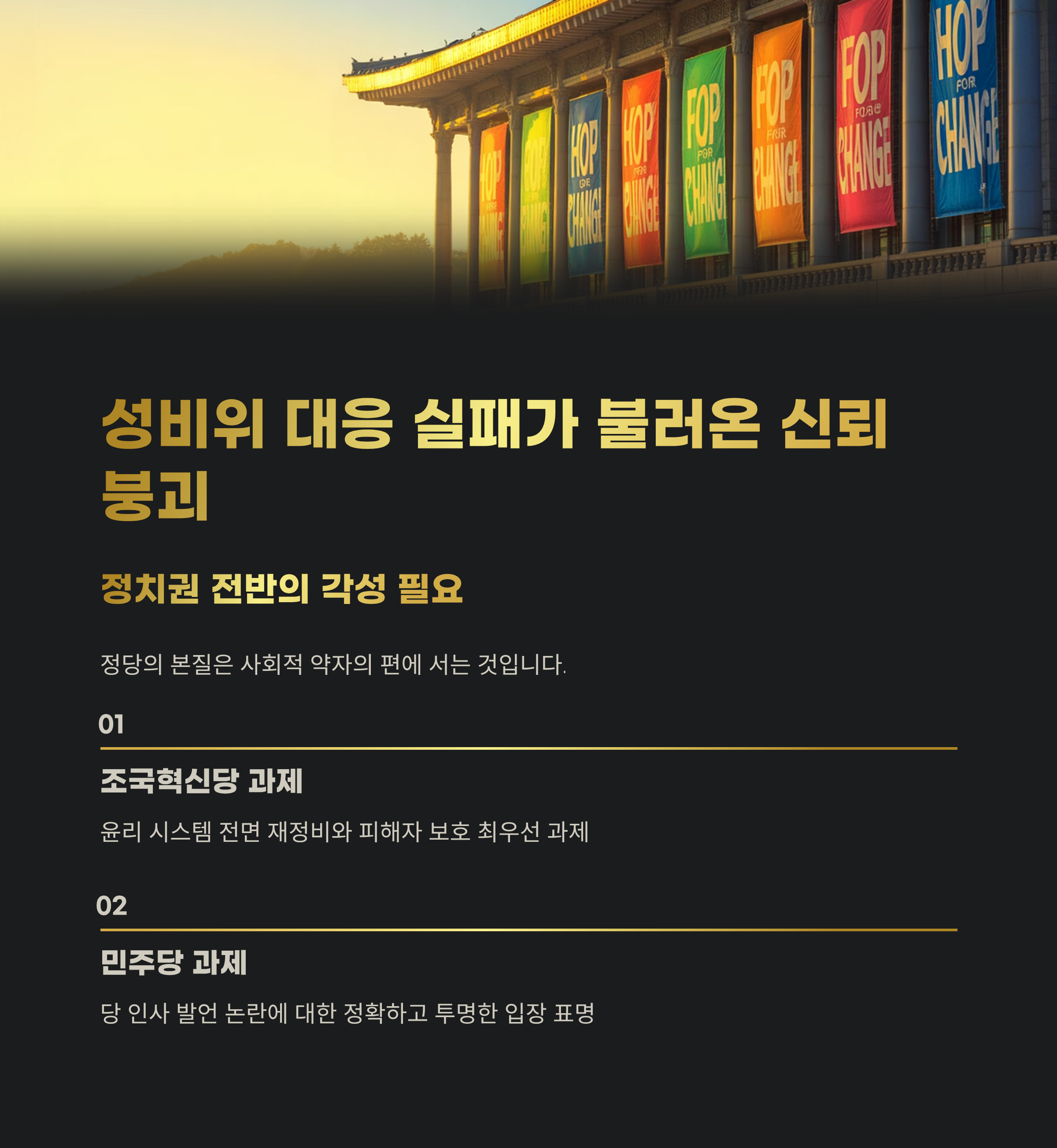 조국혁신당은 윤리 시스템을 전면 재정비하고 피해자 보호를 최우선 과제로 삼아야 하며, 민주당 역시 당 인사의 발언 논란에 대해 정확하고 투명한 입장을 내놓아야 합니다.