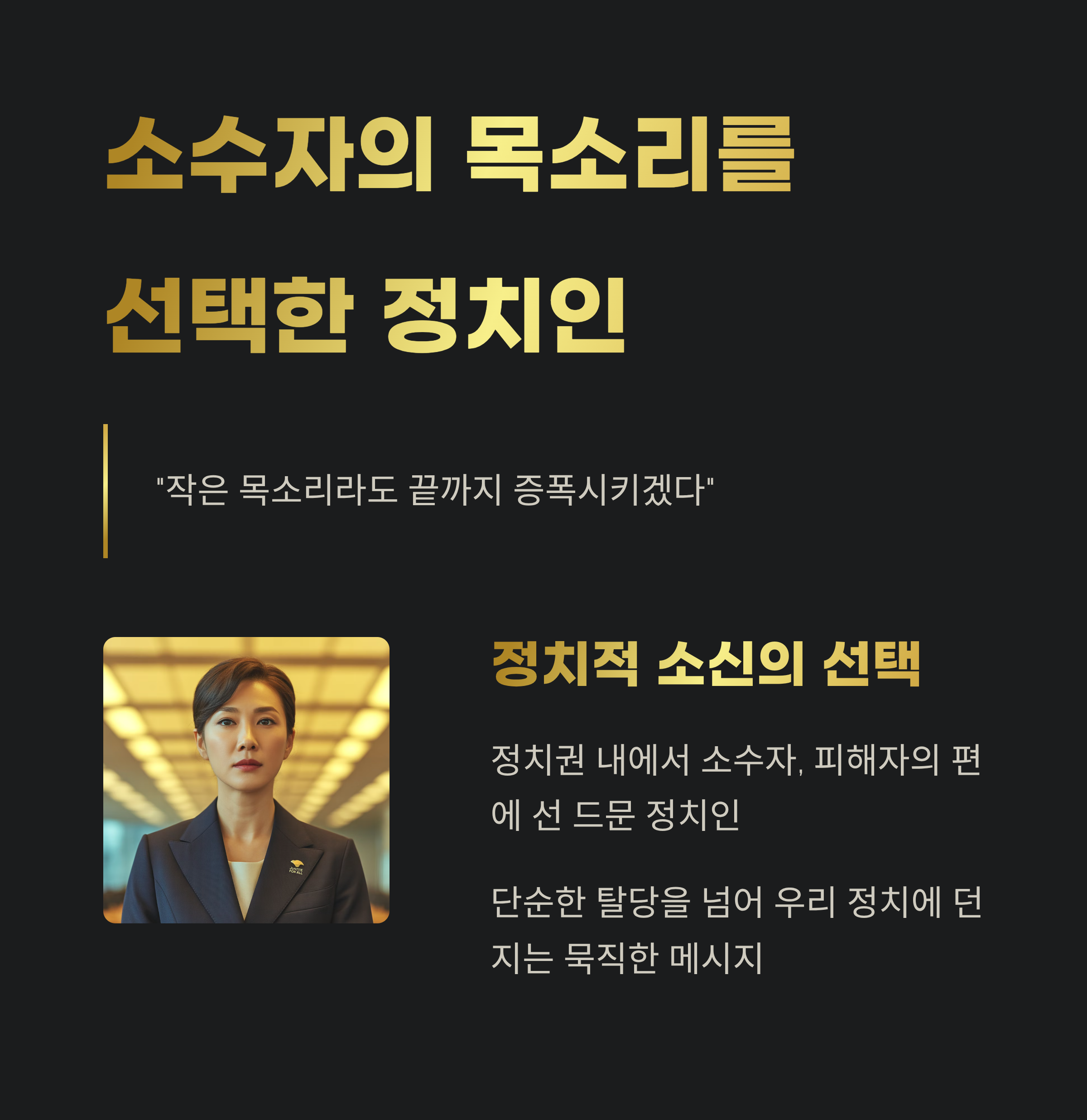 정치권 내에서 소수자, 피해자의 편에 선 정치인이 얼마나 드문지를 생각해볼 때, 그녀의 행동은 단순한 탈당을 넘어 우리 정치에 던지는 묵직한 메시지였습니다.