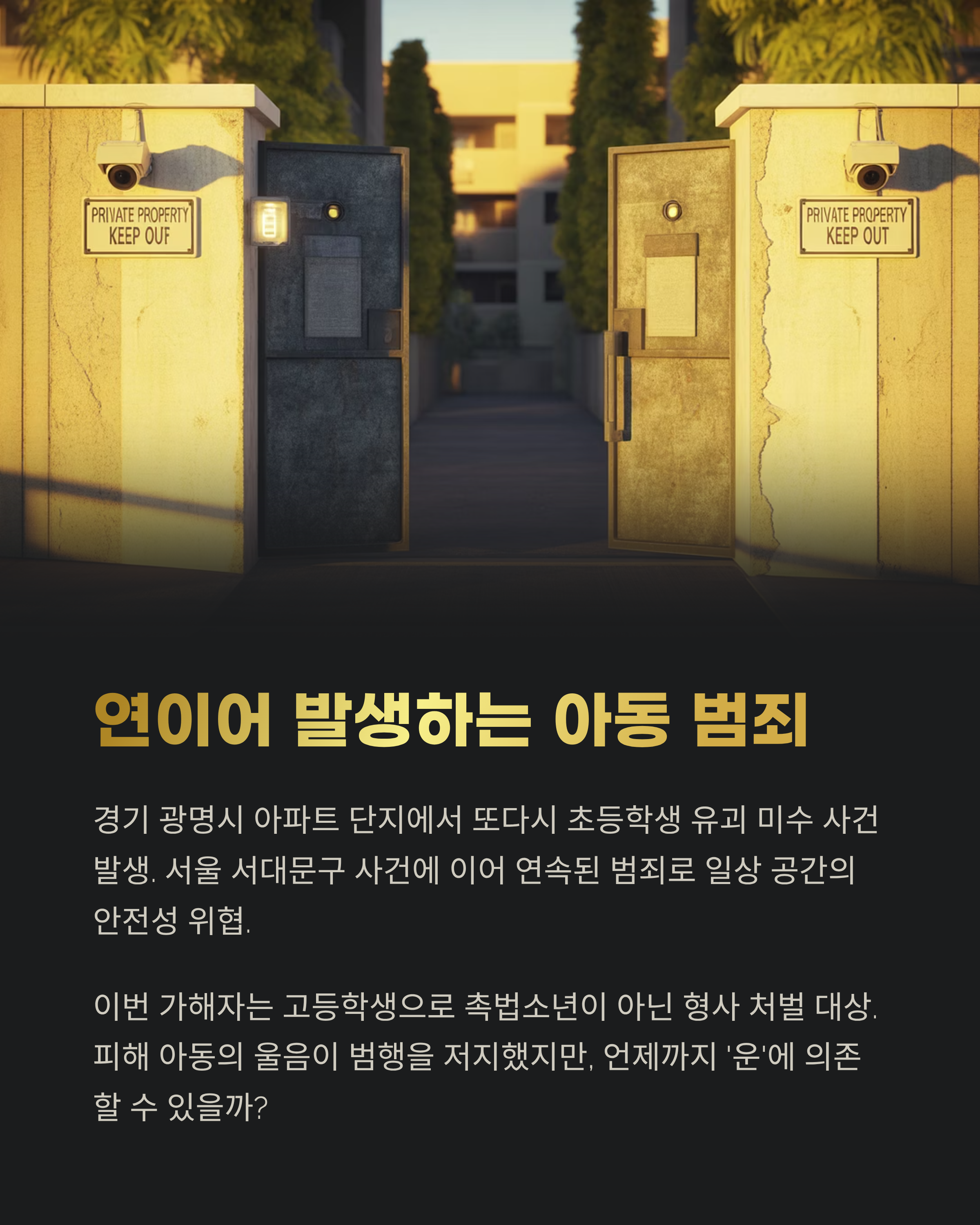 경기 광명시 아파트 단지에서 또다시 초등학생을 노린 유괴 미수 사건이 발생했습니다. 최근 서울 서대문구 사건에 이어 연이어 벌어진 일련의 범죄는, 아이들이 매일 오가는 생활 공간마저 더 이상 안전하지 않다는 현실을 보여주고 있습니다. 이번 사건의 가해자는 고등학생으로 촉법소년이 아니며, 형사 처벌 대상입니다. 피해 아동의 울음이 다행히 범행을 막아냈지만, 언제까지 이런 ‘운’에 의존할 수 있을까요?