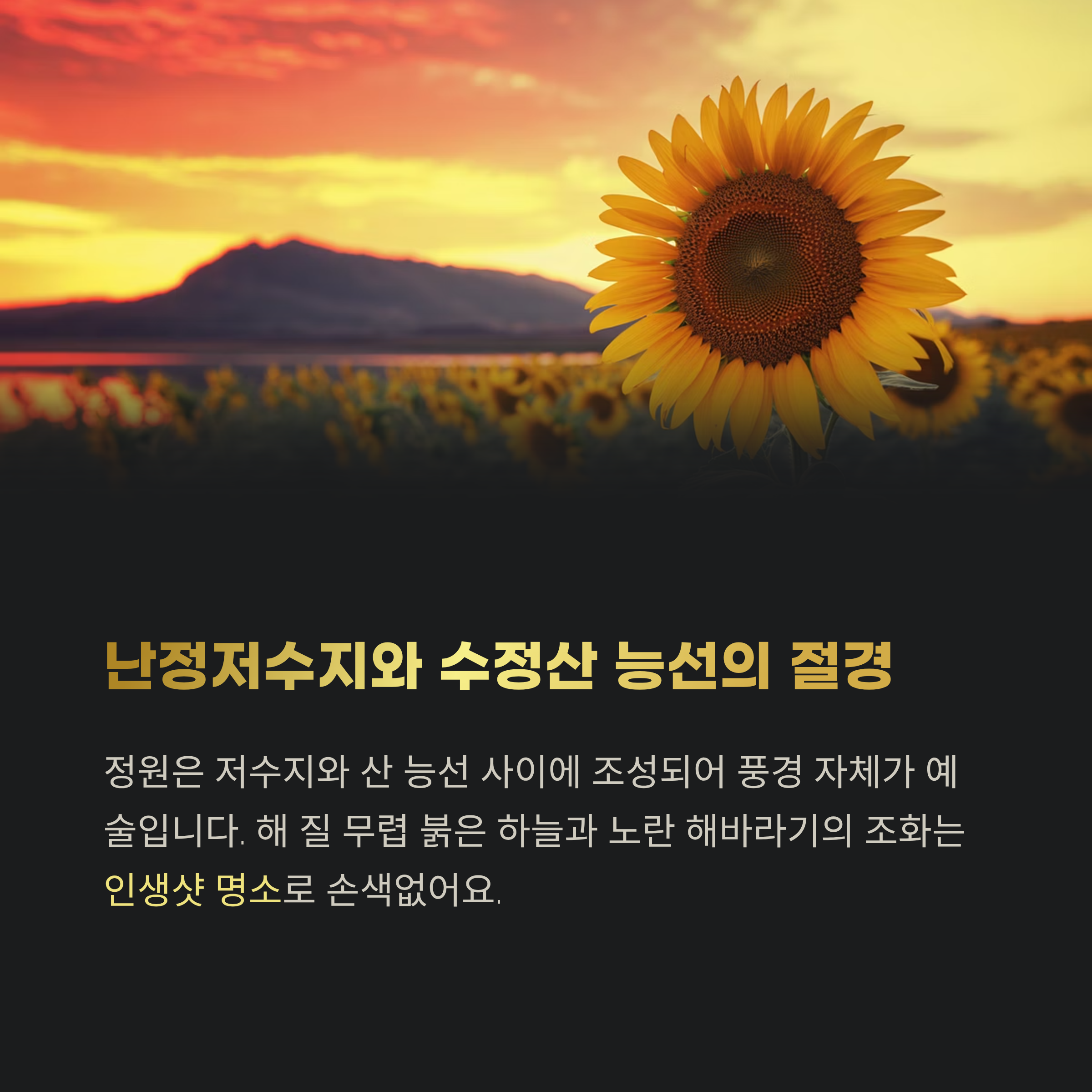 특히 해 질 무렵 붉게 물든 하늘과 노란 해바라기의 조화는 인생샷 명소로 손색없죠.