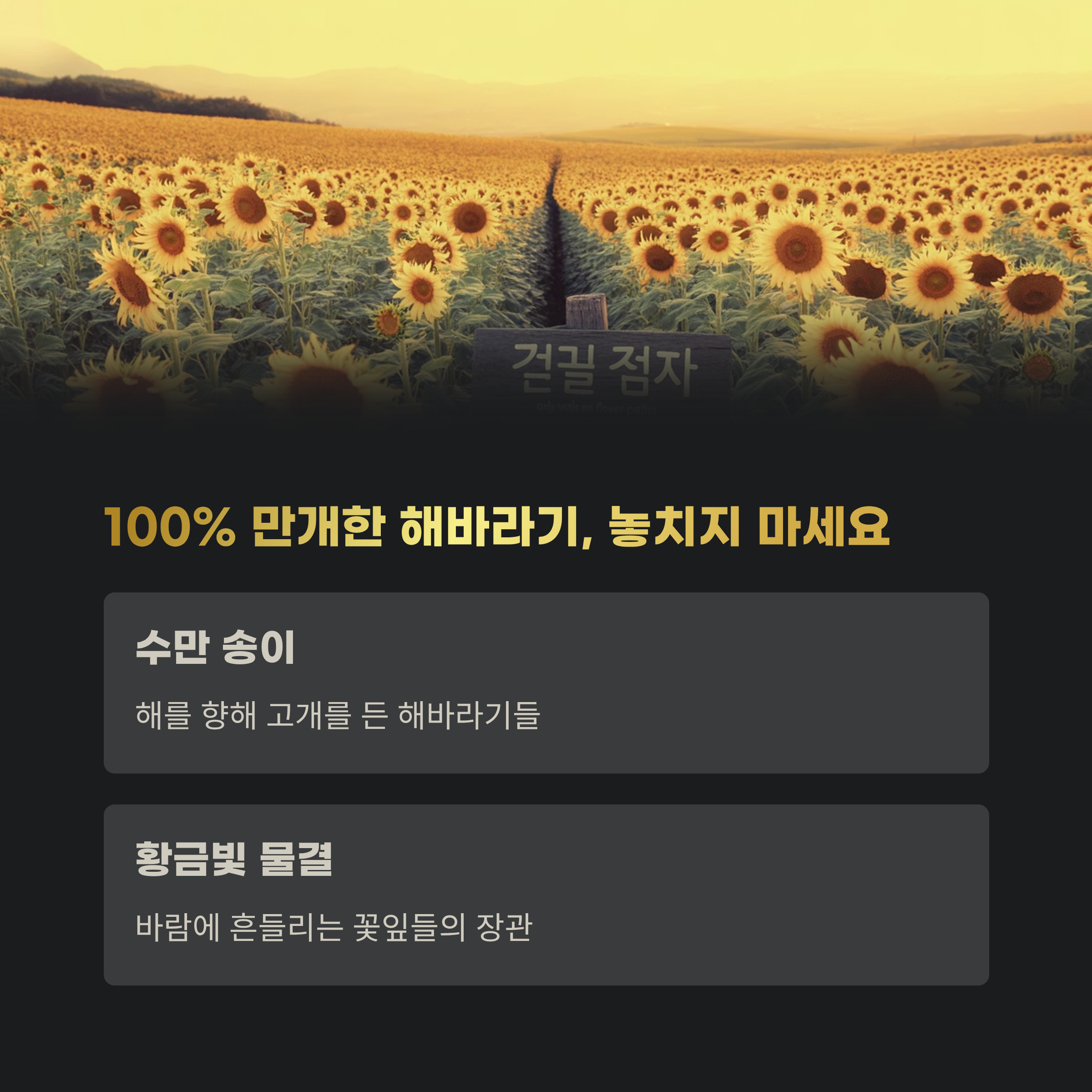 특히 해 질 무렵 붉게 물든 하늘과 노란 해바라기의 조화는 인생샷 명소로 손색없죠.