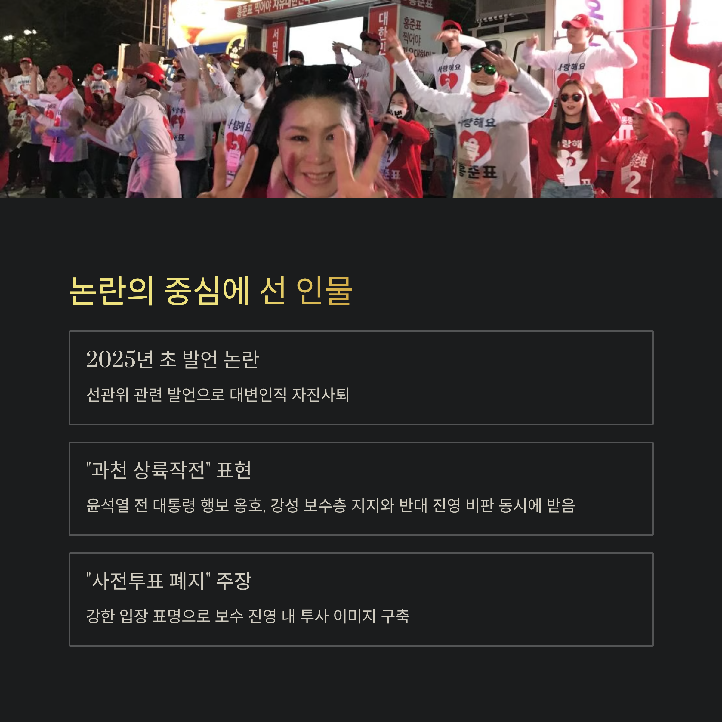 당시 "과천 상륙작전"이라는 표현으로 윤석열 전 대통령의 행보를 옹호하며 강성 보수층의 지지를 받았지만, 반대 진영의 비판도 동시에 받았습니다.