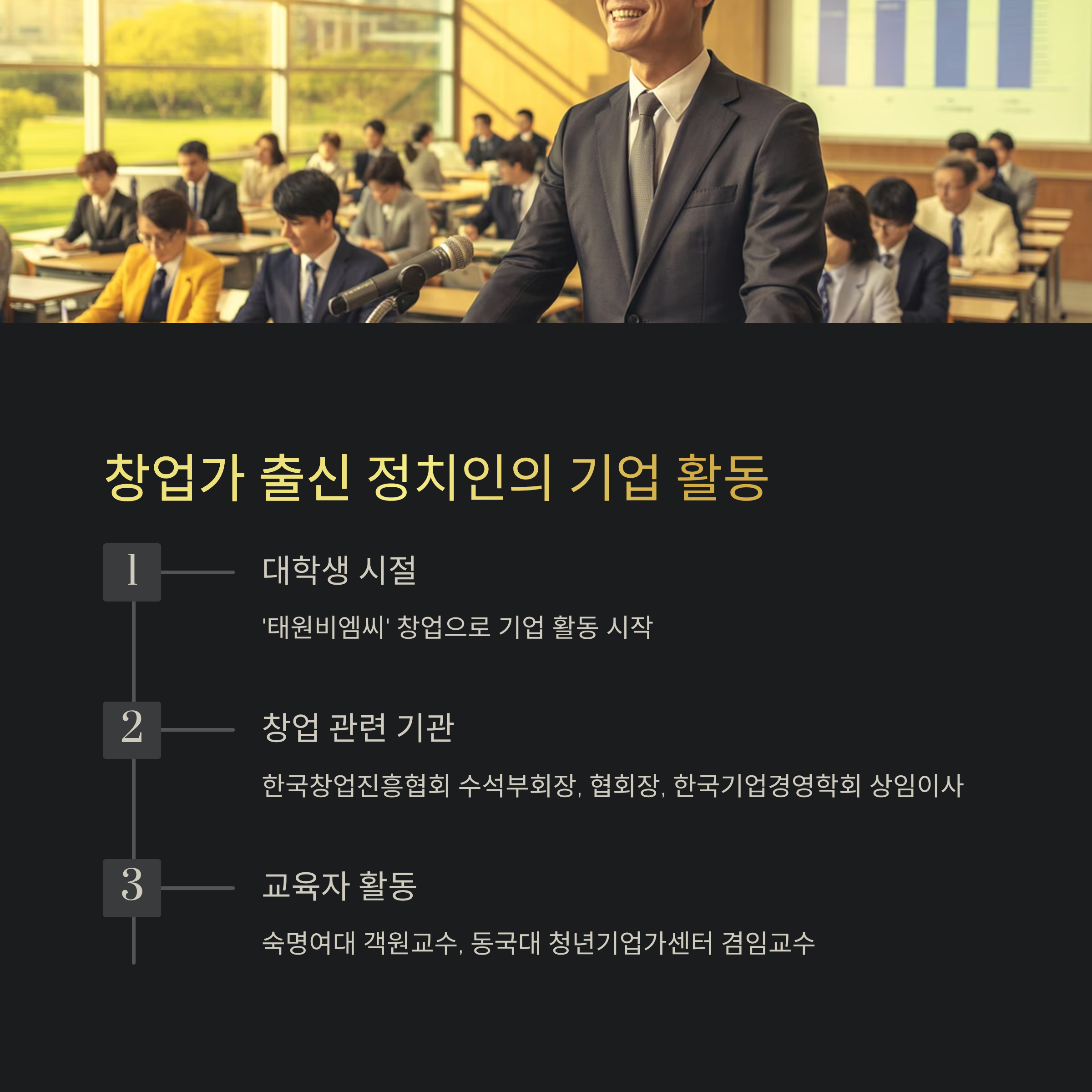 실제 창업·기업 경험과 교육, 정치 영역까지 아우르는 그의 이력은 앞으로 당 내 역할 확대와 총선, 대선에서의 전략적 포지션에도 큰 영향을 미칠 것으로 예상됩니다.