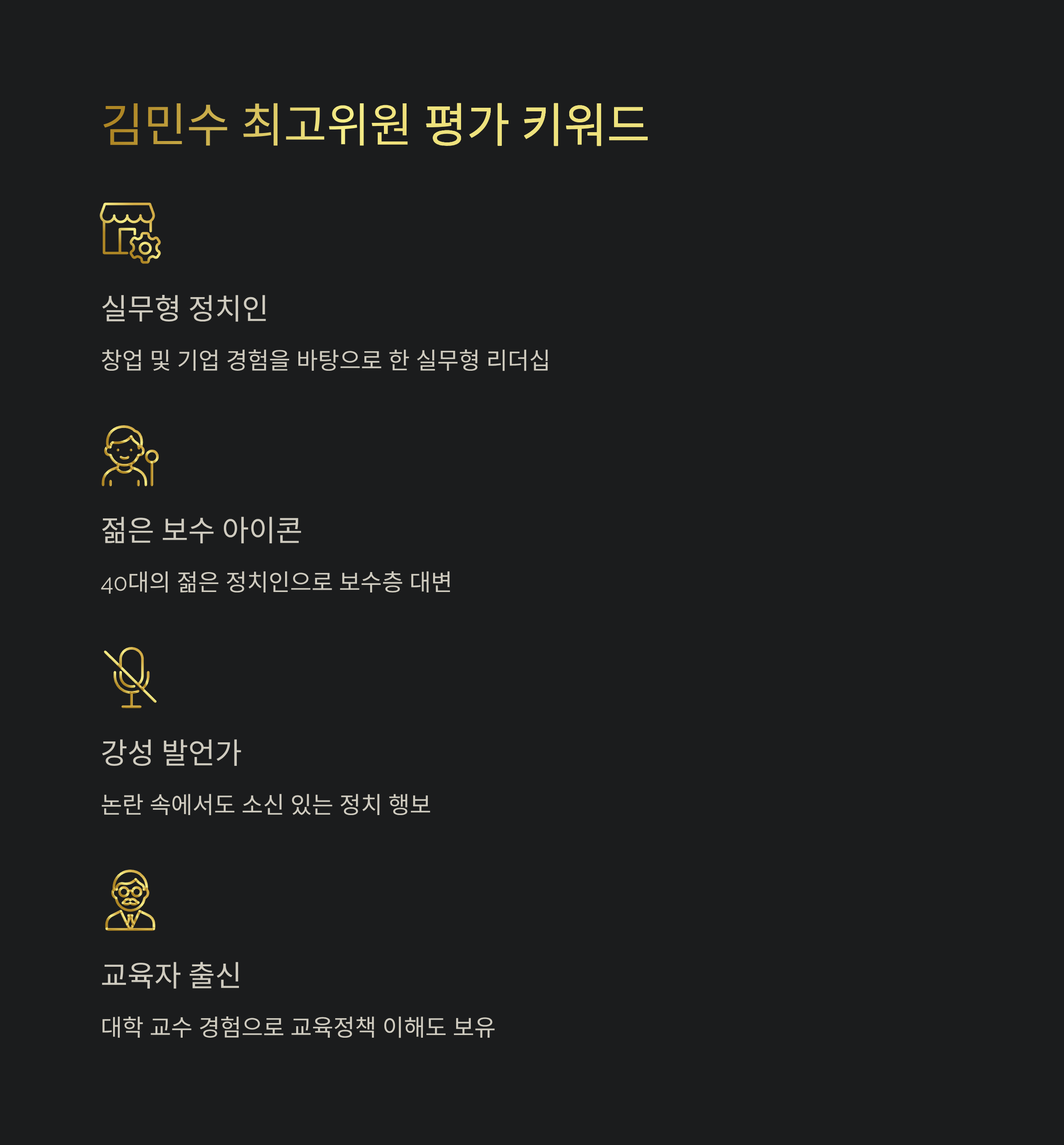 김민수 최고위원은 40대 정치인으로서 보수 진영에 신선한 활력을 불어넣고 있다는 평가를 받고 있습니다.