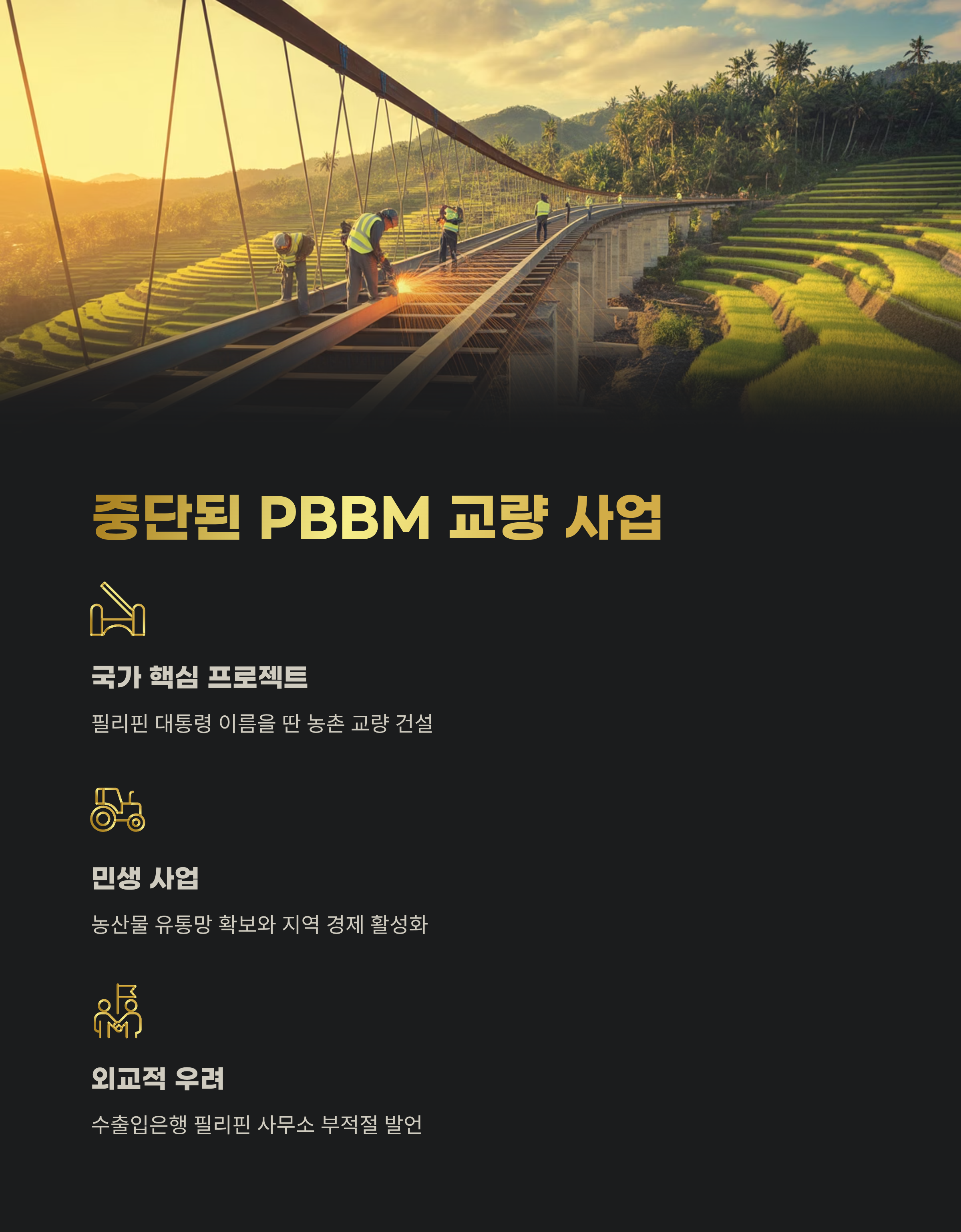 권 의원은 중단된 사업이 단순한 차관이 아닌, 필리핀 대통령의 이름을 딴 국가 핵심 프로젝트였다고 밝혔습니다. 농촌 교량 건설을 통해 농산물 유통망을 확보하고 지역 경제를 활성화하려는 민생 사업이었다는 설명입니다.