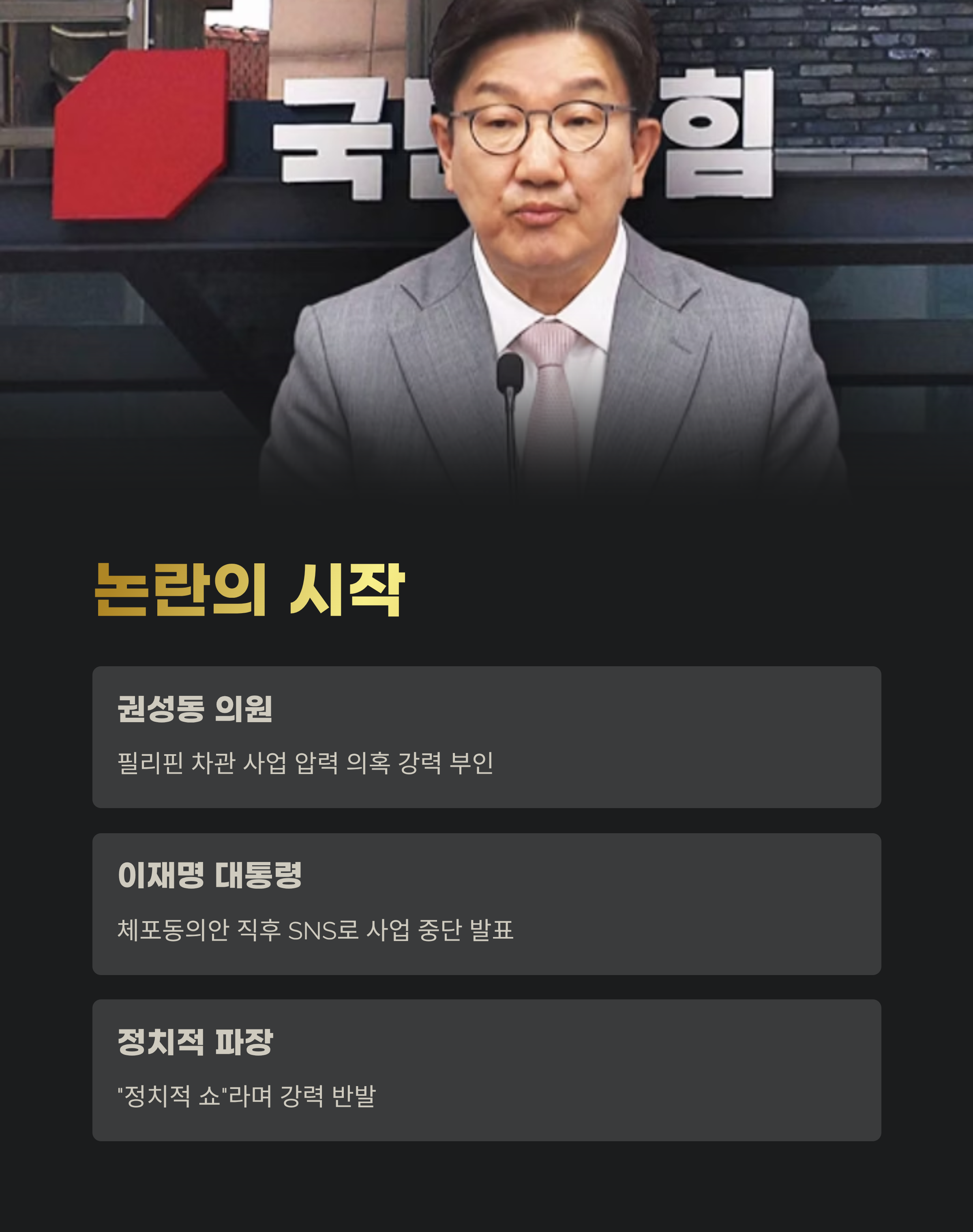 권성동 국민의힘 의원이 '필리핀 차관 사업'과 관련해 자신에게 제기된 압력 의혹을 강하게 부인하며, 이에 대해 즉각 중단을 지시한 이재명 대통령을 향해 “정적 탄압”이라고 주장했습니다. 특히 체포동의안이 국회에 보고된 직후 대통령이 SNS를 통해 사업 중단을 알린 것에 대해 “정치적 쇼”라고 규정하며 반발했는데요. 이번 사안은 정치권 전반에 강한 파장을 일으키고 있습니다.