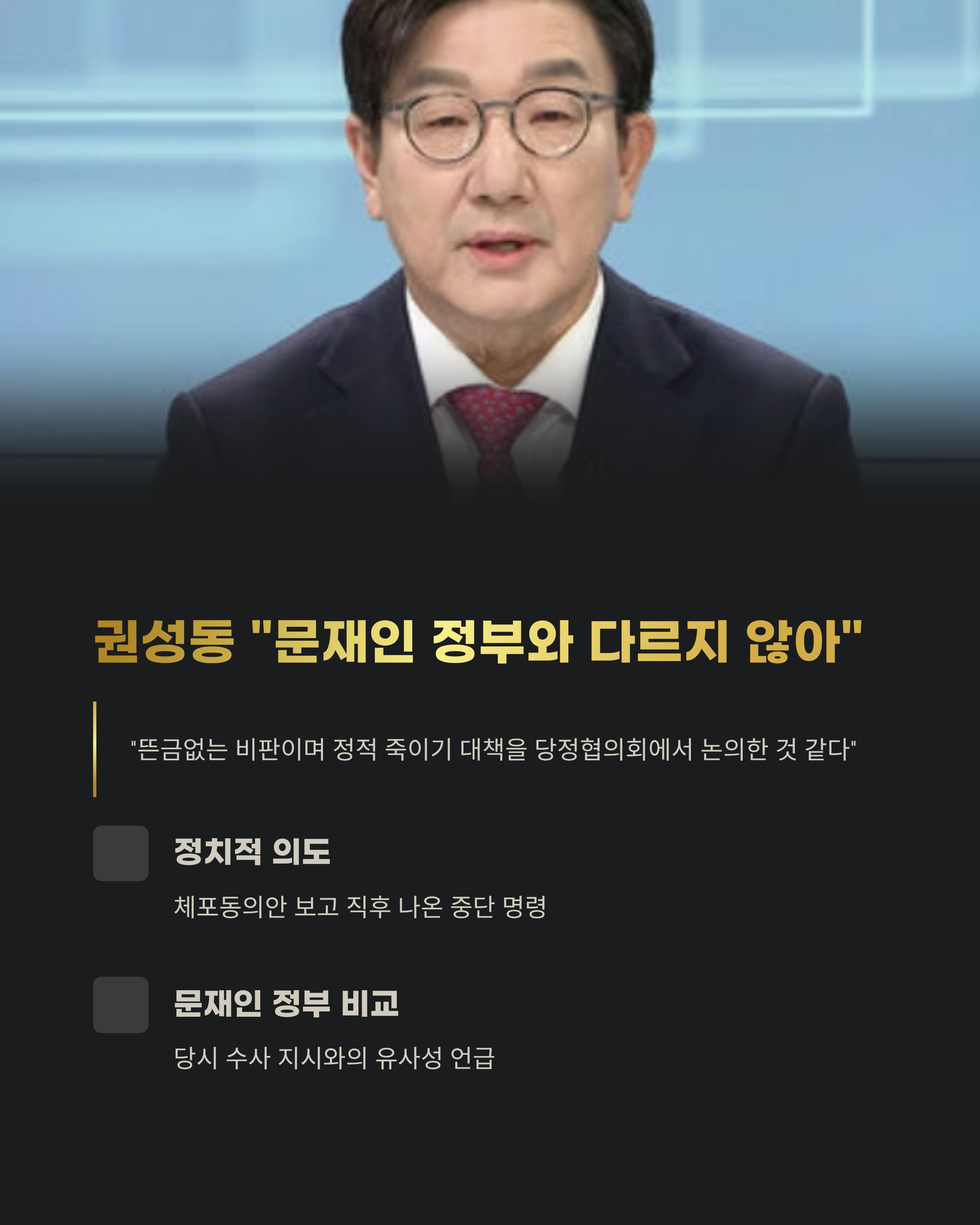 그는 “정적 죽이기 대책을 당정협의회에서 논의한 것 같다”며 문재인 정부 당시 수사 지시와의 유사성을 언급했습니다.
