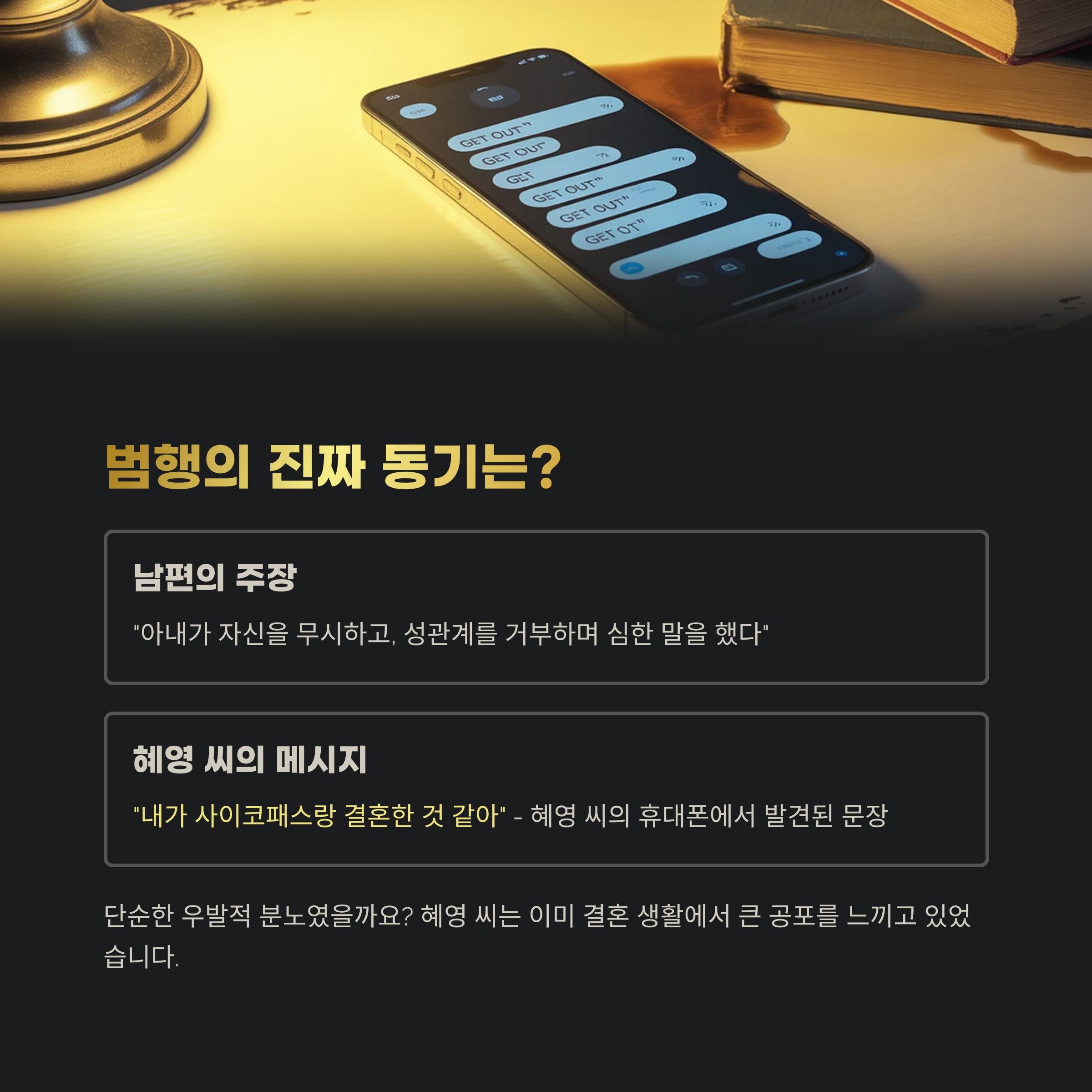 제작진은 혜영 씨의 휴대폰에서 “내가 사이코패스랑 결혼한 것 같아”라는 문장을 발견했습니다. 혜영 씨가 생전에 친구들과 주고받은 메시지들은 이미 그녀가 결혼 생활에서 큰 공포를 느끼고 있었음을 보여줍니다.
