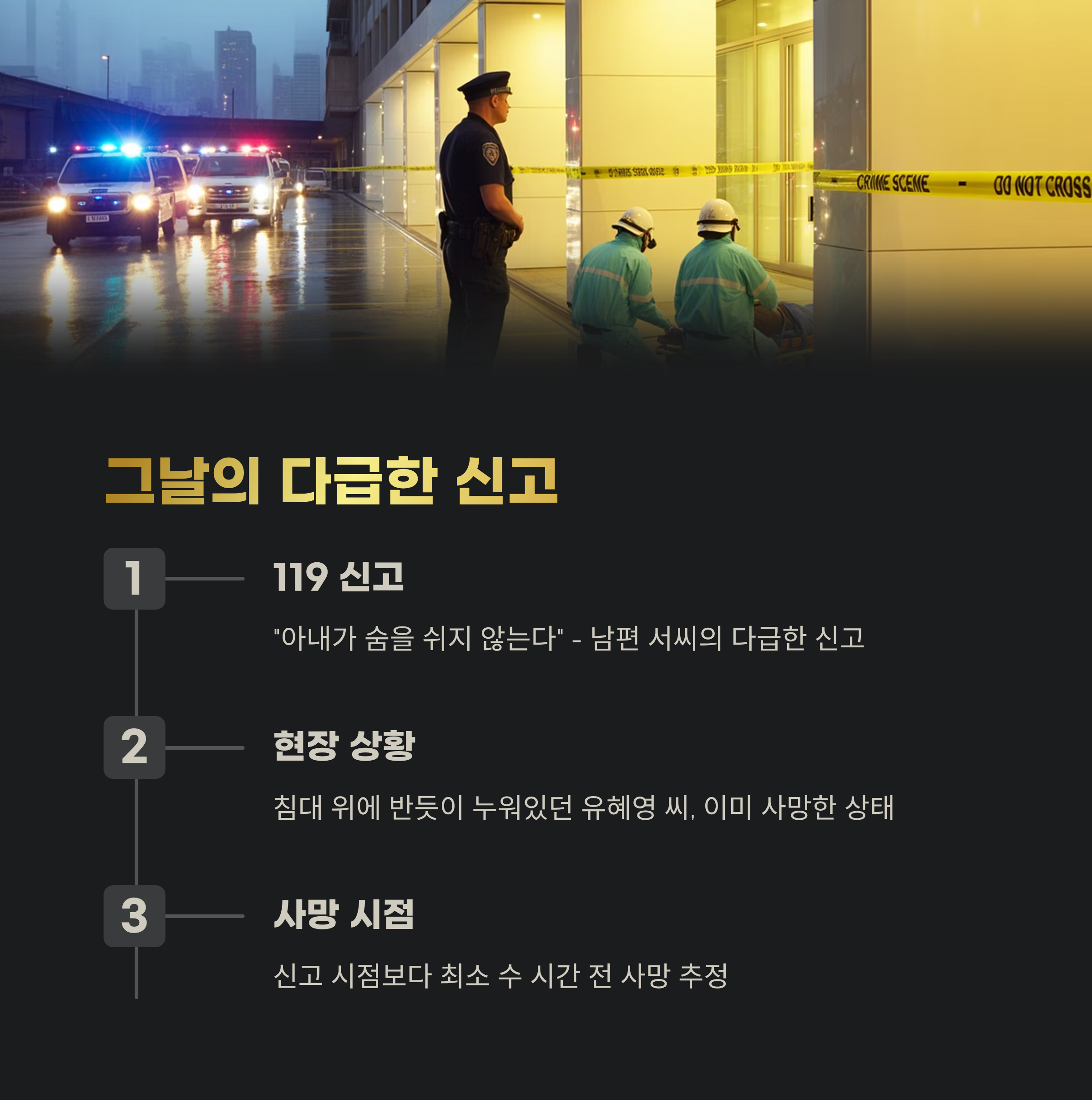 신고자는 “아내가 숨을 쉬지 않는다”며 도움을 요청했고, 현장에 출동한 구급대는 이미 사망한 상태의 유혜영 씨를 발견했습니다. 시신은 침대 위에 반듯이 누워 있었고, 사망 추정 시점은 최소 수 시간 전. 건강에 별다른 이상이 없던 유 씨의 갑작스러운 죽음은 단순한 사고로 보기에 어려운 정황들이 많았습니다.