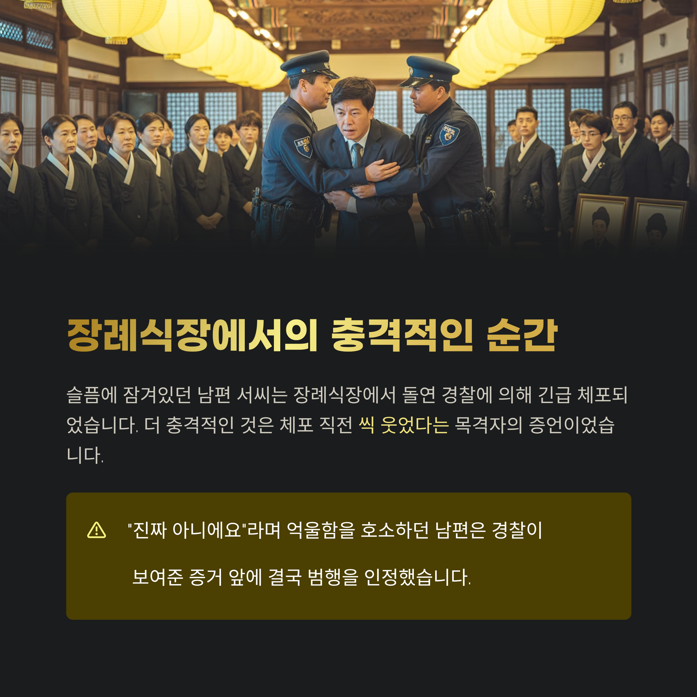슬픔에 잠겨있던 남편 서씨는 장례식장에서 돌연 경찰에 의해 긴급 체포됩니다. 가족들과 조문객들은 충격을 감추지 못했지만, 더 큰 충격은 서씨가 체포 직전 씩 웃었다는 목격자의 증언이었습니다.