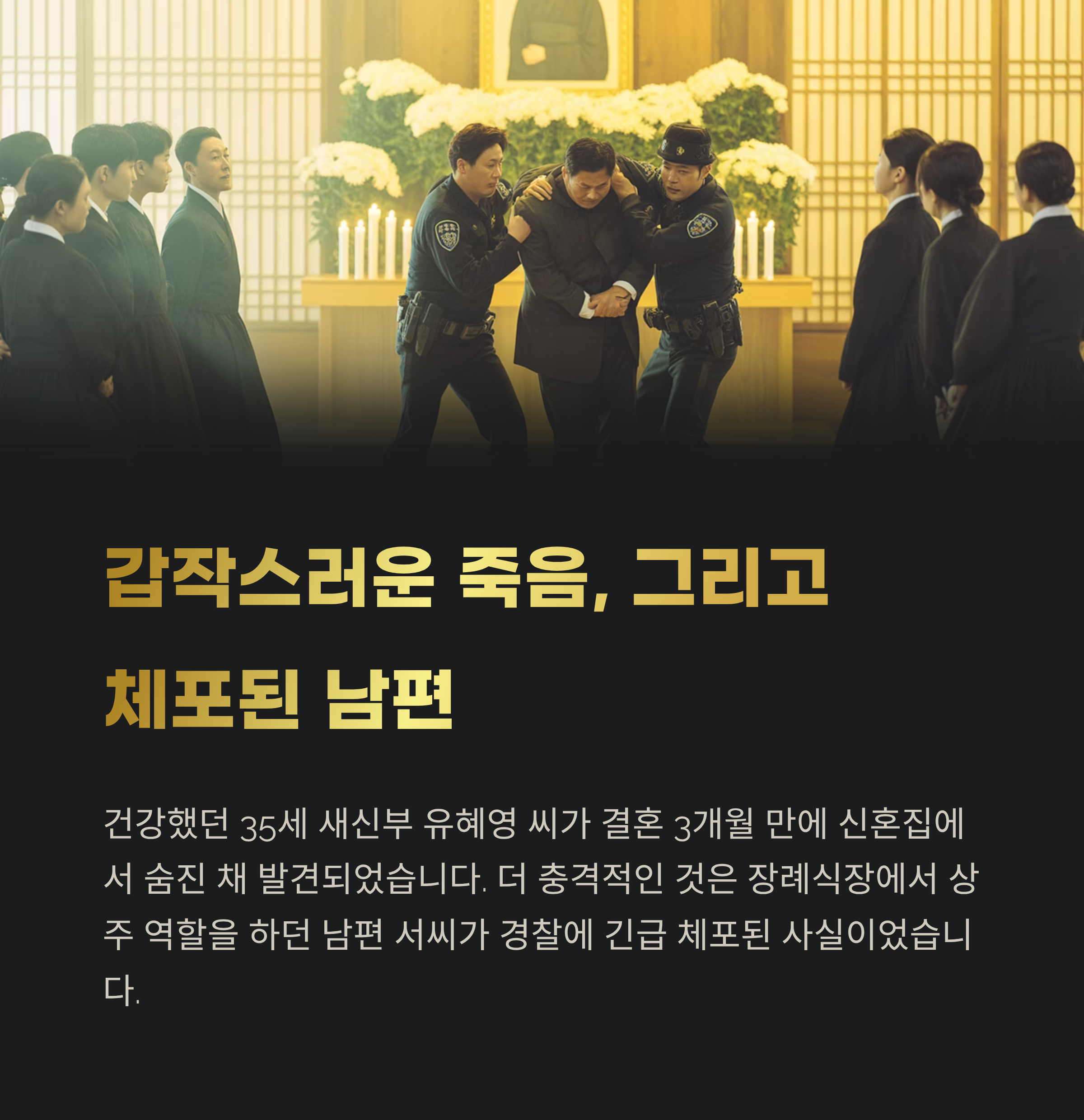 슬픔에 잠겨있던 남편 서씨는 장례식장에서 돌연 경찰에 의해 긴급 체포됩니다. 가족들과 조문객들은 충격을 감추지 못했지만, 더 큰 충격은 서씨가 체포 직전 씩 웃었다는 목격자의 증언이었습니다.