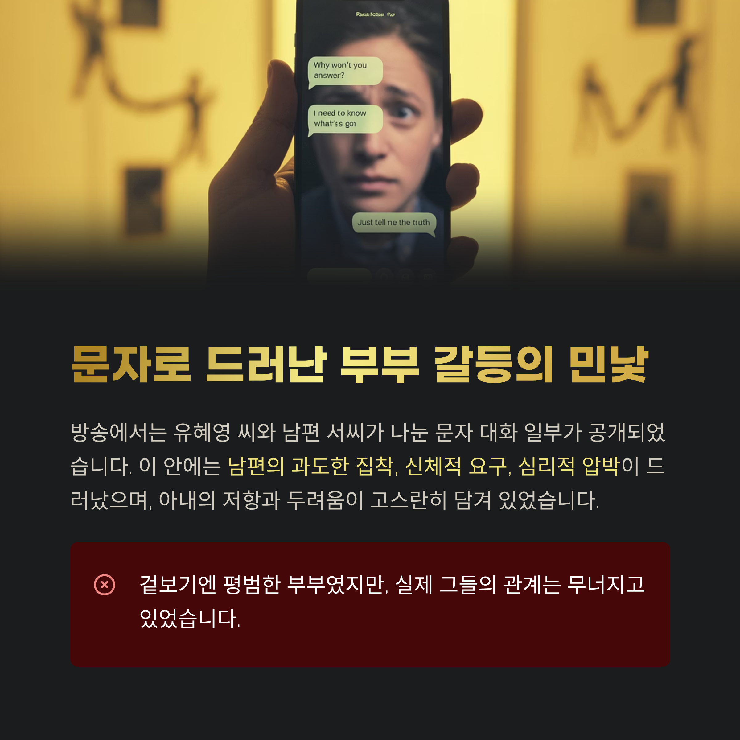 방송에서는 유혜영 씨가 남편 서씨와 나눈 문자 대화 일부도 공개되었습니다.