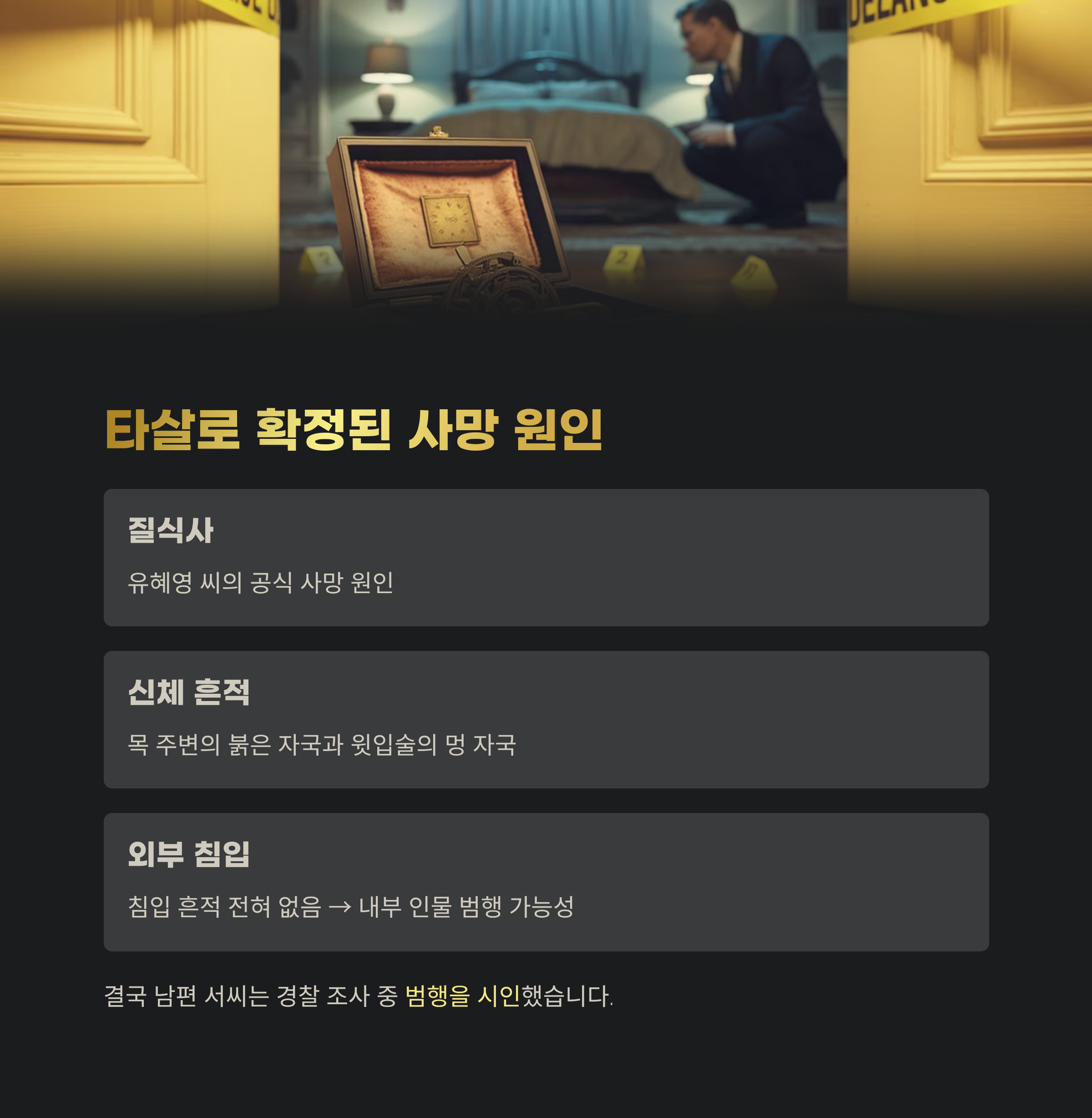 | 수사 결과 | 목 졸림 흔적 → 타살 확정 |