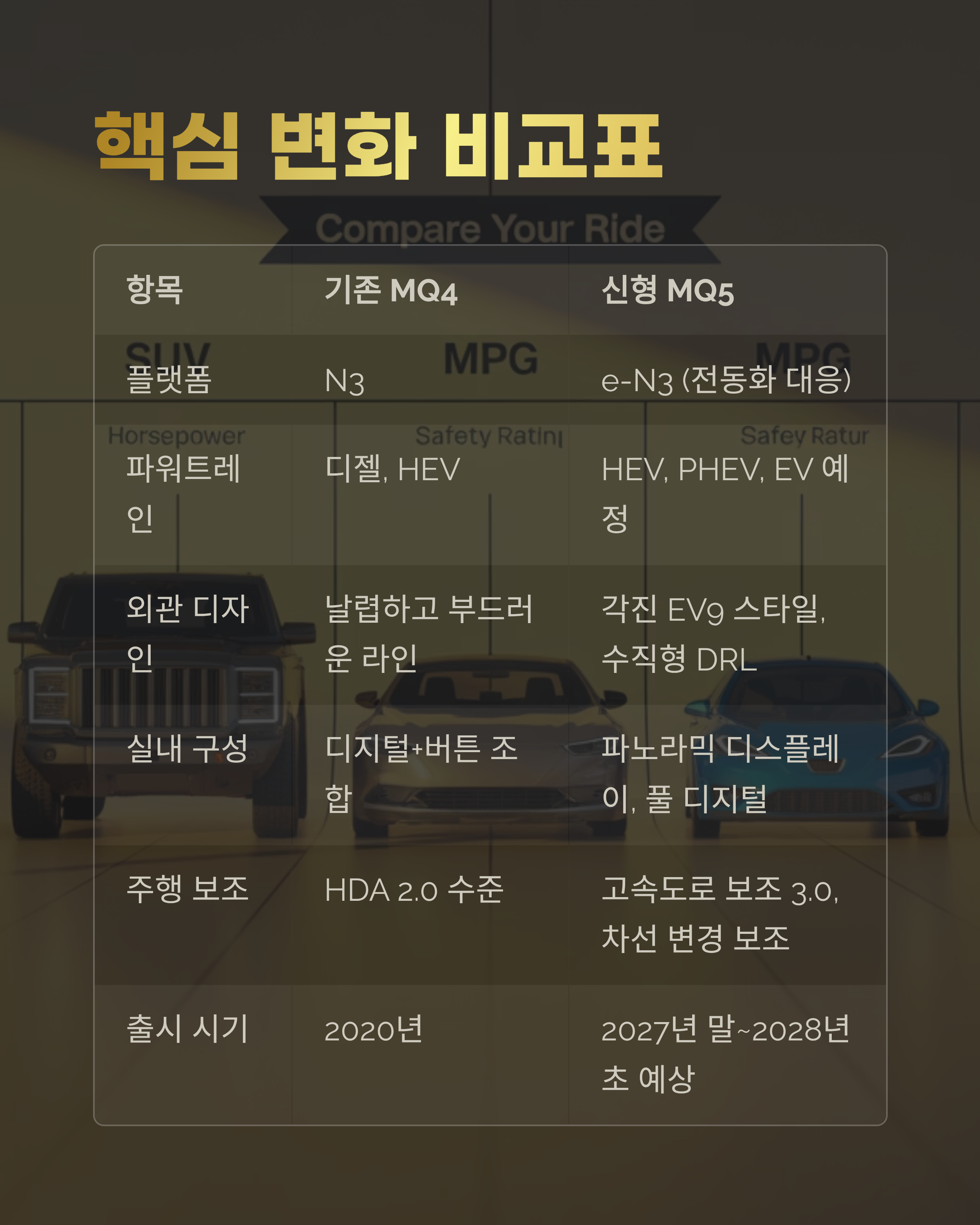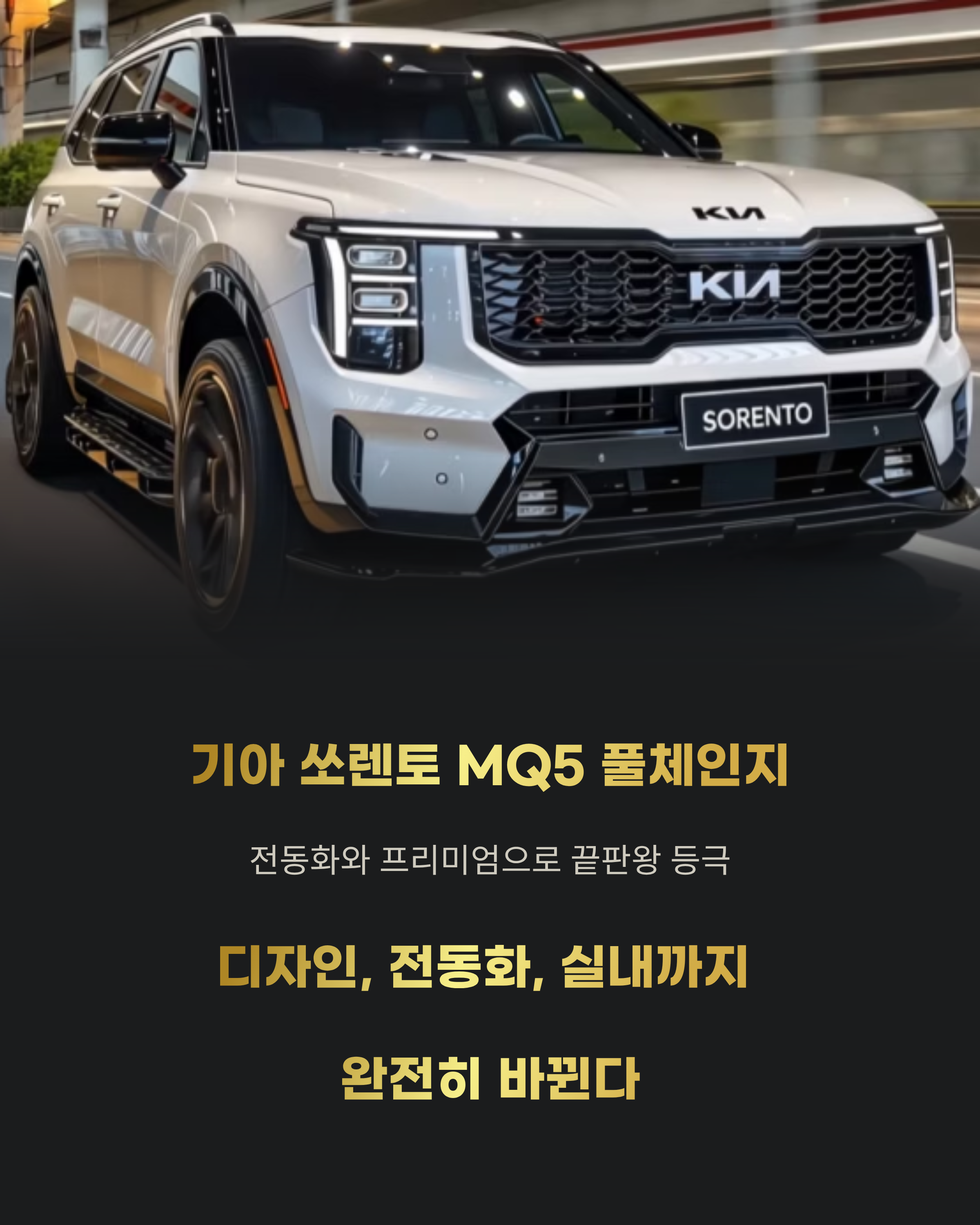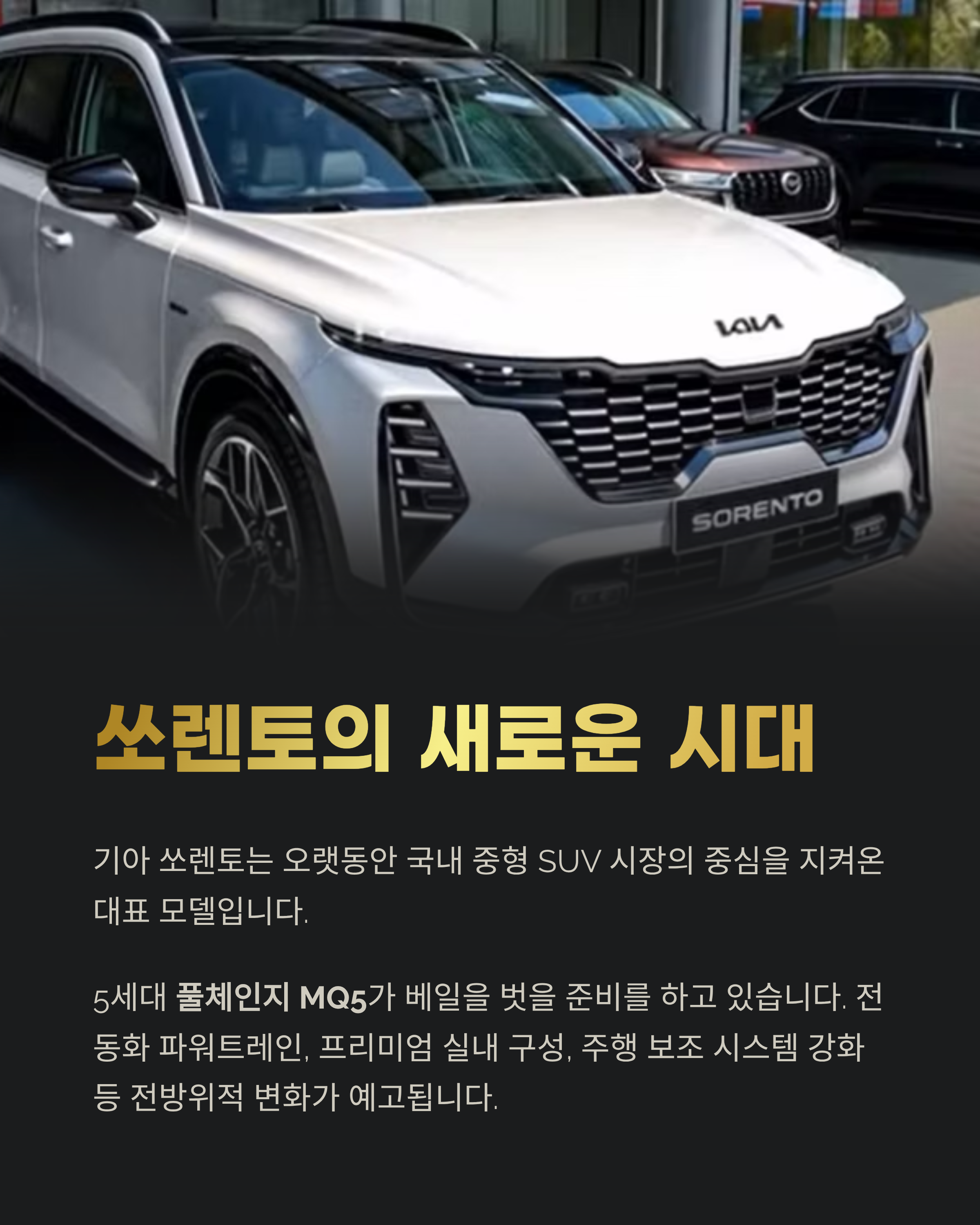 기아 쏘렌토는 오랫동안 국내 중형 SUV 시장의 중심을 지켜온 대표 모델입니다. 그리고 이제, 5세대 풀체인지 MQ5가 베일을 벗을 준비를 하고 있습니다. 단순한 외형 개선을 넘어 전동화 파워트레인, 프리미엄 실내 구성, 주행 보조 시스템 강화 등 전방위적 변화가 예고되며, 그야말로 “끝판왕 SUV”라는 기대를 받고 있죠. 이번 글에서는 MQ5 쏘렌토의 핵심 변화 포인트를 정리해봅니다.