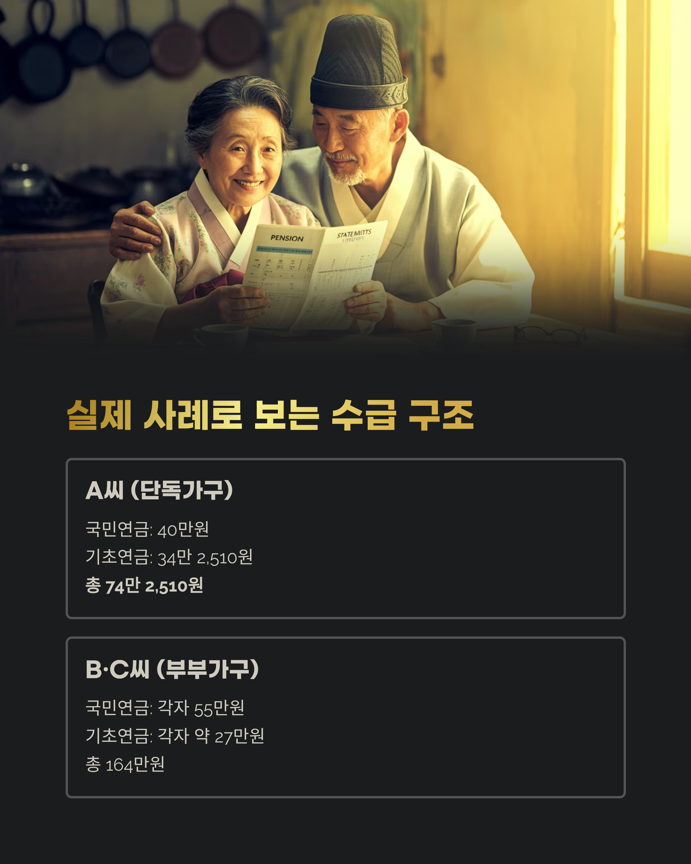 | 총합 수령 | 74만 2,510원 | 부부 합산 약 164만 원 |