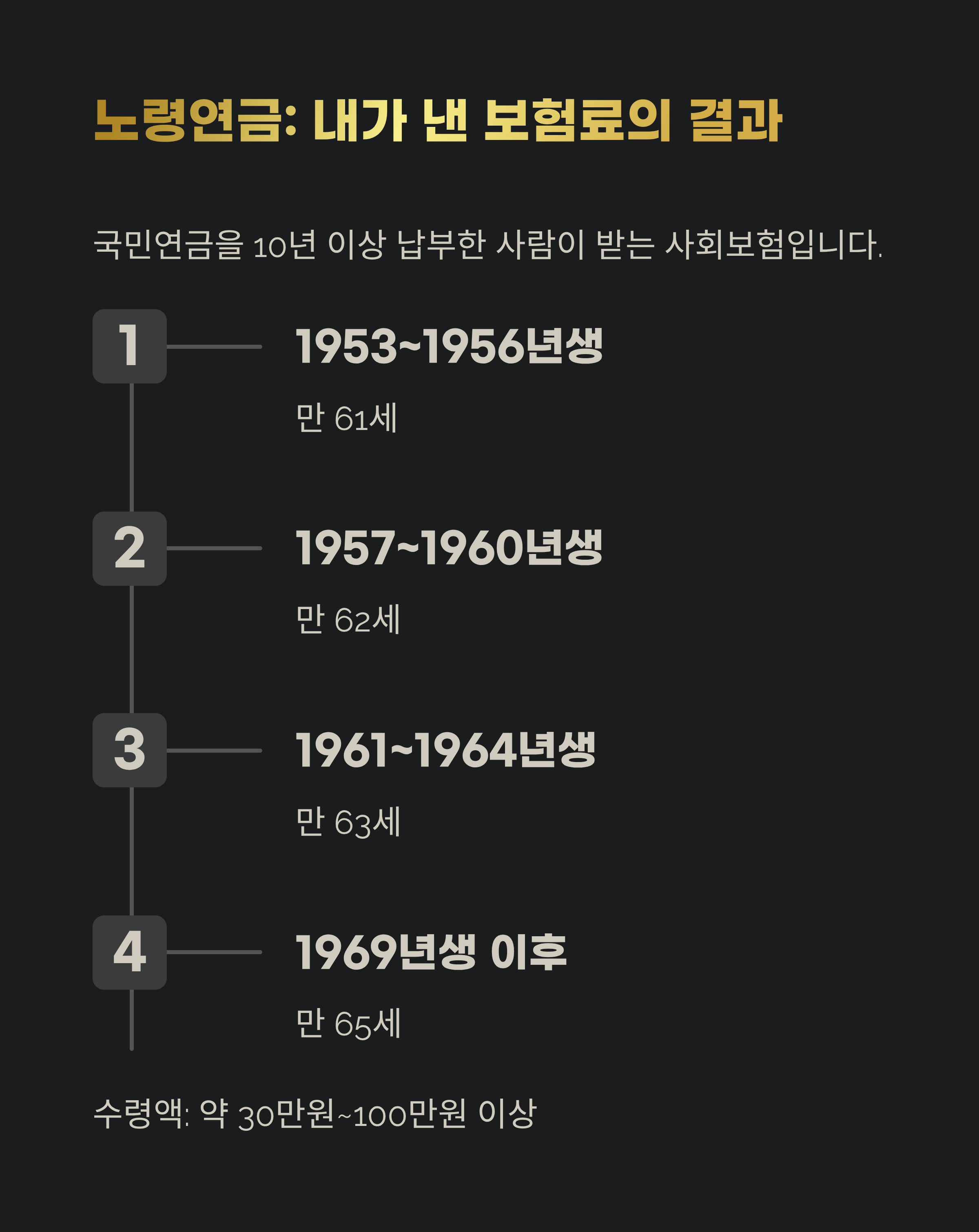 2025년 기준 노령연금 수령 금액은 약 30만 원~100만 원 이상까지 다양하게 나옵니다.