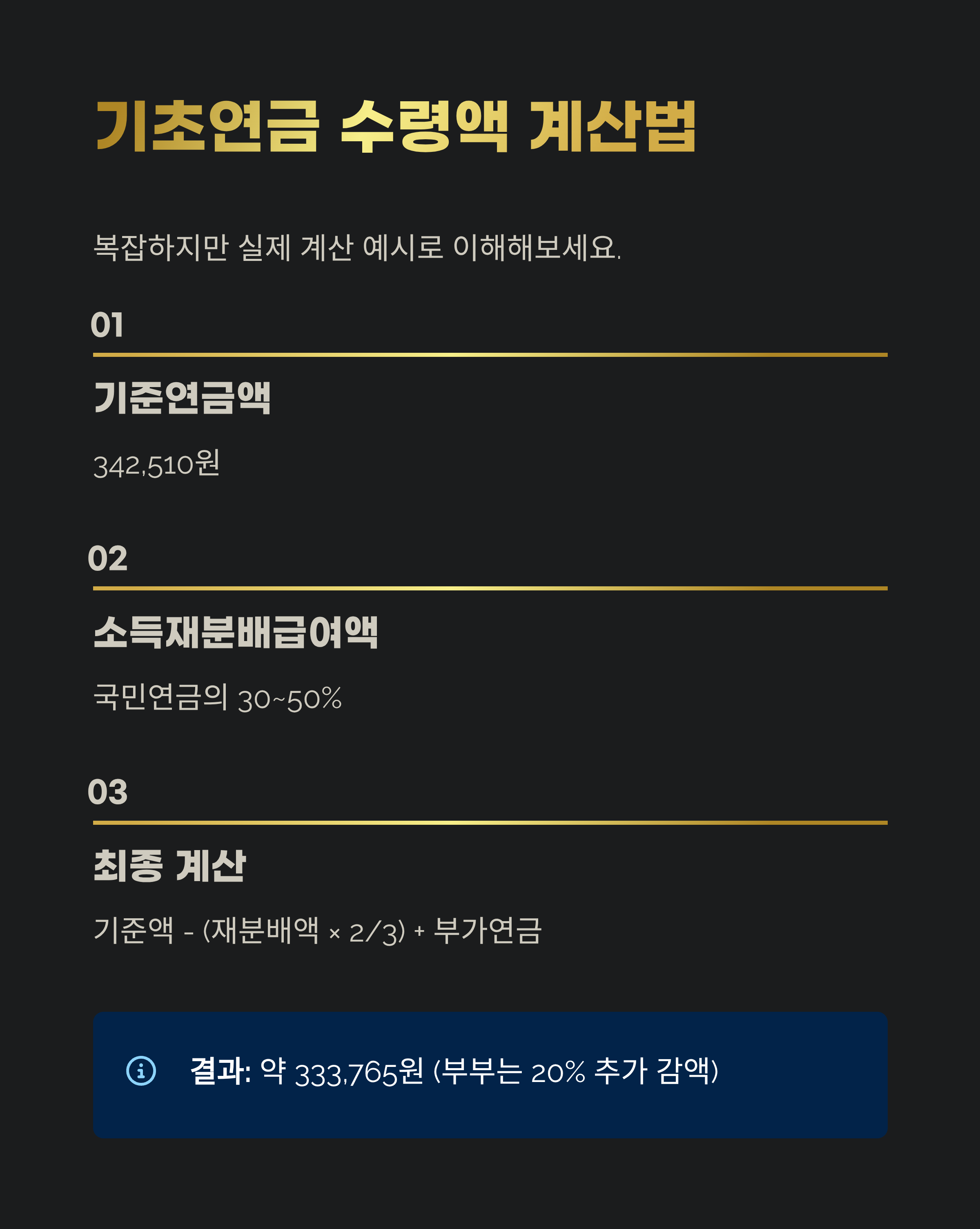 기초연금 = 기준연금액 – (소득재분배급여액 × 2/3) + 부가연금액(기준의 50%)