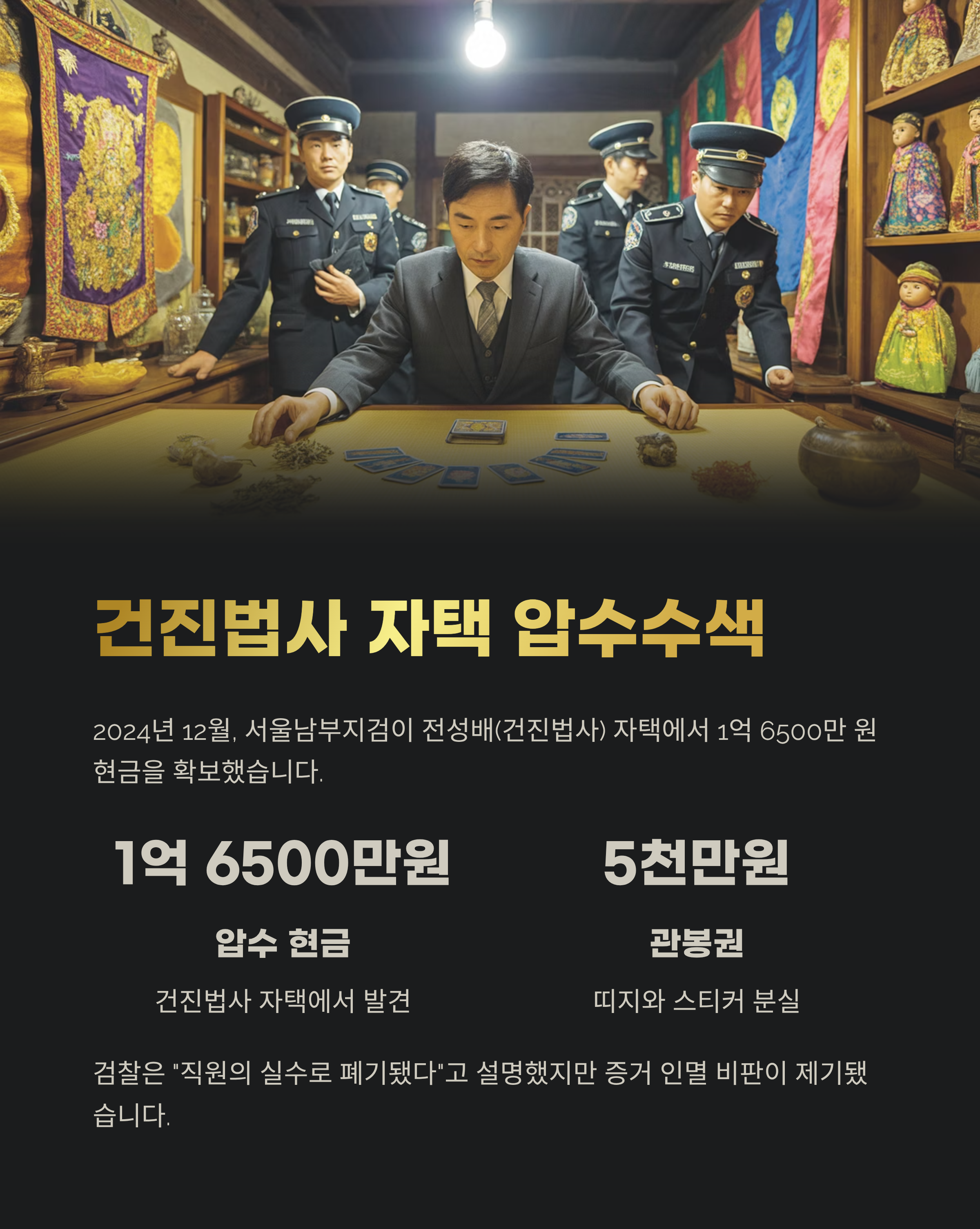 2024년 12월, 서울남부지검은 무속인 전성배(건진법사)의 자택을 압수수색하면서 1억 6500만 원의 현금을 확보했습니다.