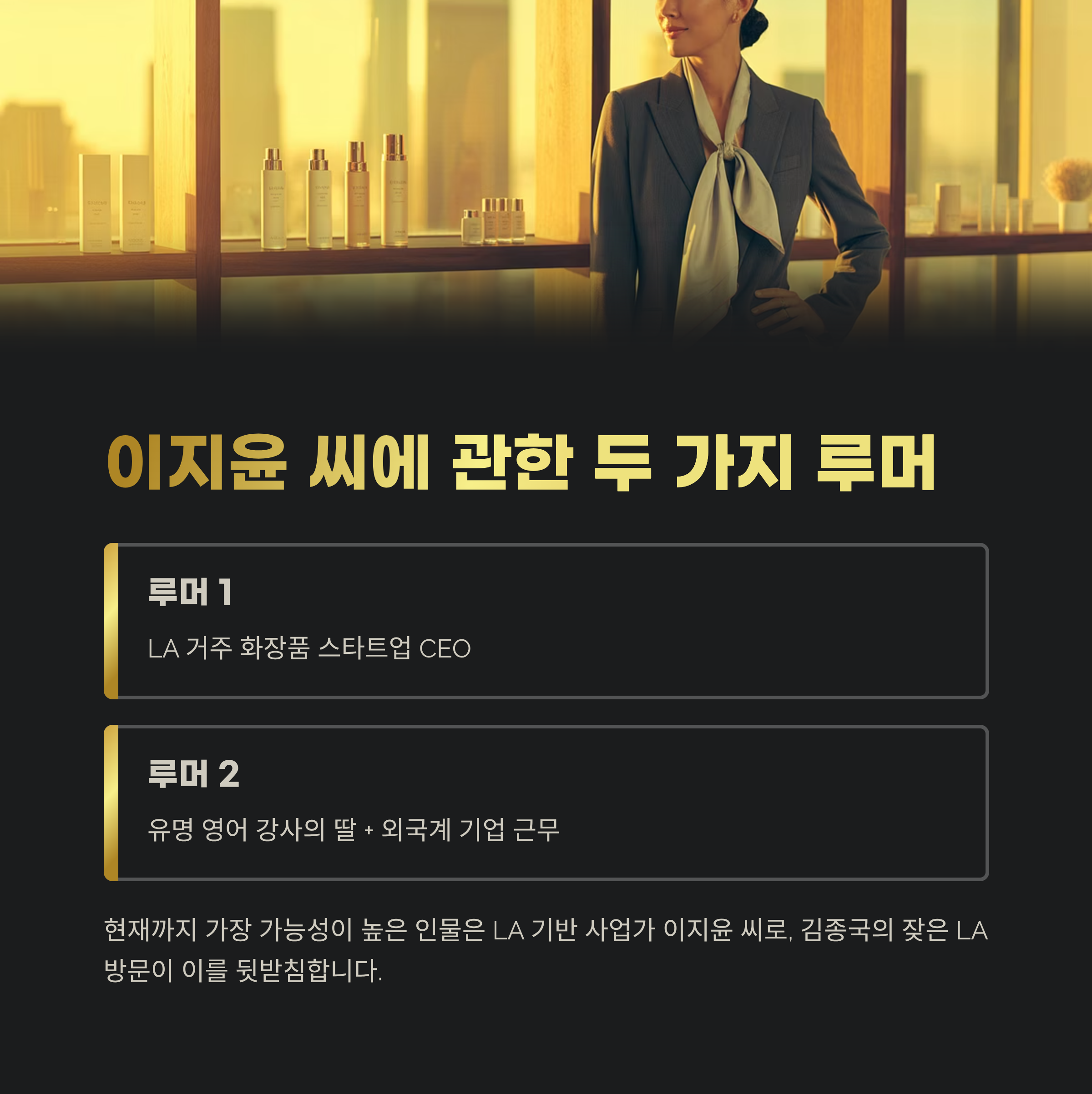 현재까지 가장 신빙성 있는 인물은 바로 이지윤 씨. 미국 LA에서 화장품 스타트업을 운영 중인 CEO로, 1987년생(만 38세)이라는 설이 유력합니다.