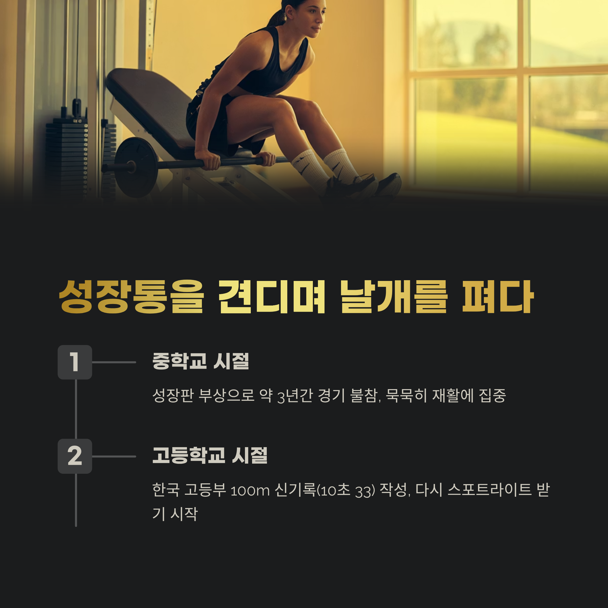 그에게도 성장판 부상이라는 시련이 있었습니다. 중학교 시절 발뒤꿈치 부상으로 약 3년간 경기에 나서지 못했지만, 묵묵히 재활에 집중했고, 고등학생이 되면서 **한국 고등부 100m 신기록(10초 33)**을 작성하며 다시 스포트라이트를 받기 시작했습니다.