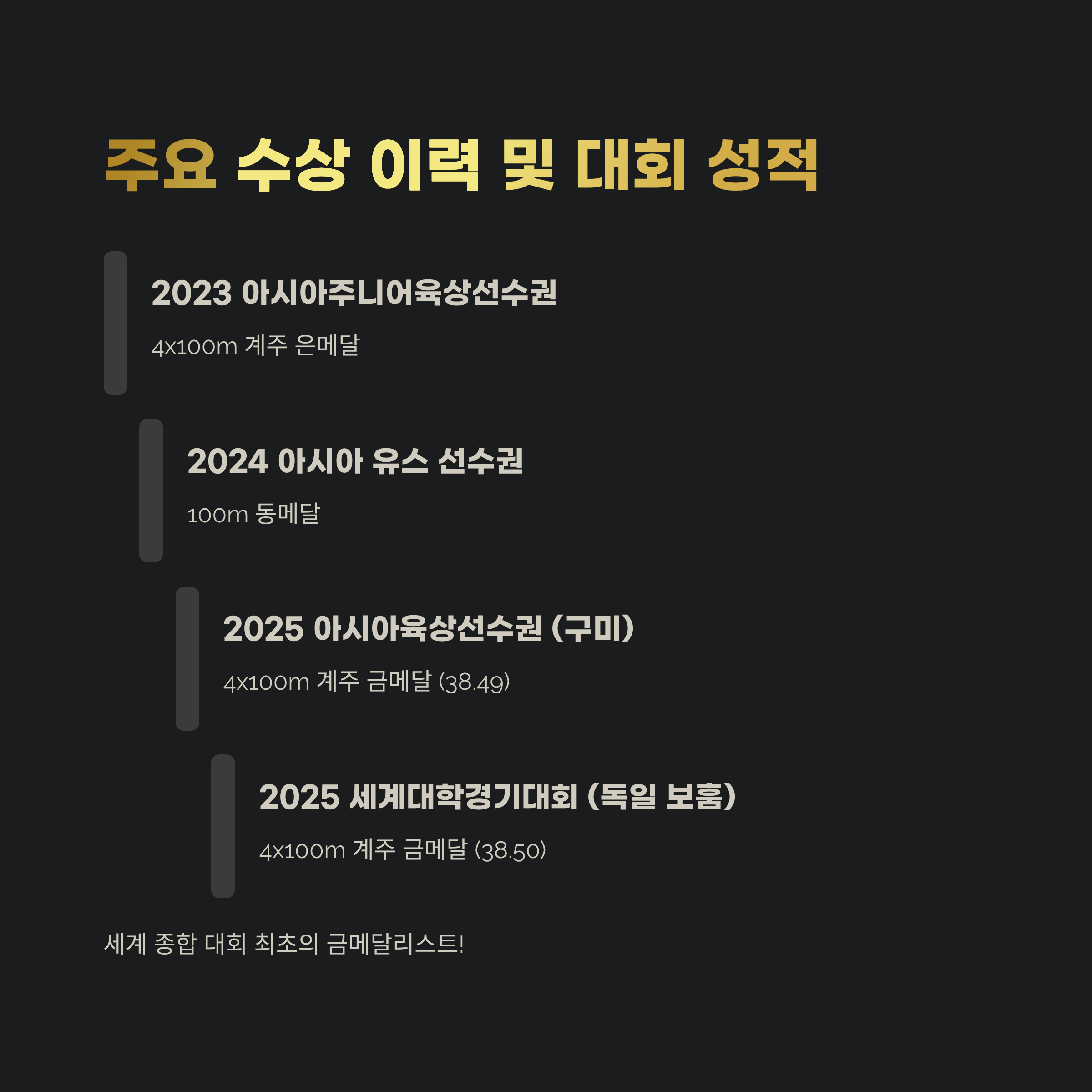 | 2025 | 아시아육상선수권 (구미) | 4x100m 계주 금메달 (38.49) |
