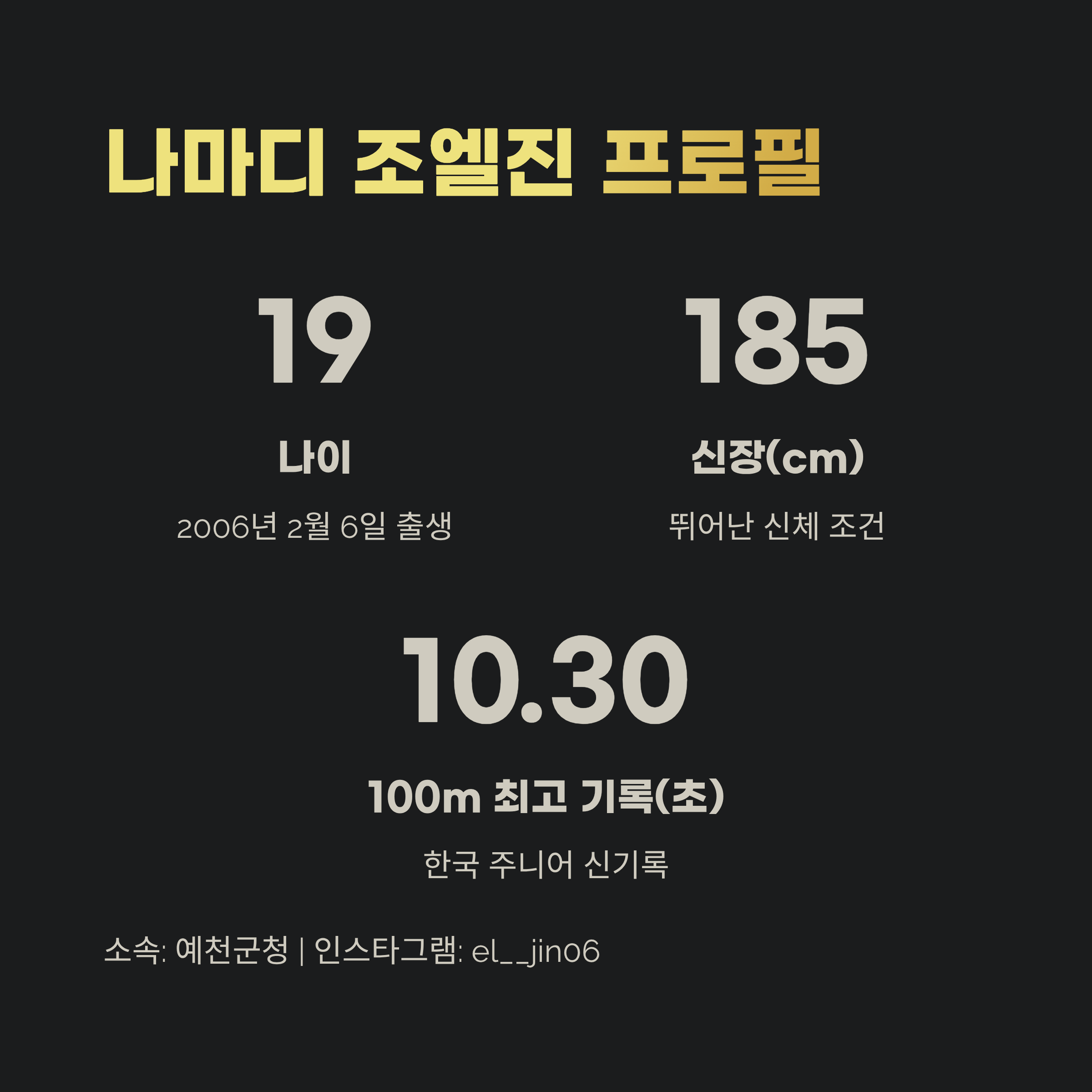 | 최고 기록 | 100m 10.30초 (한국 주니어 신기록) |