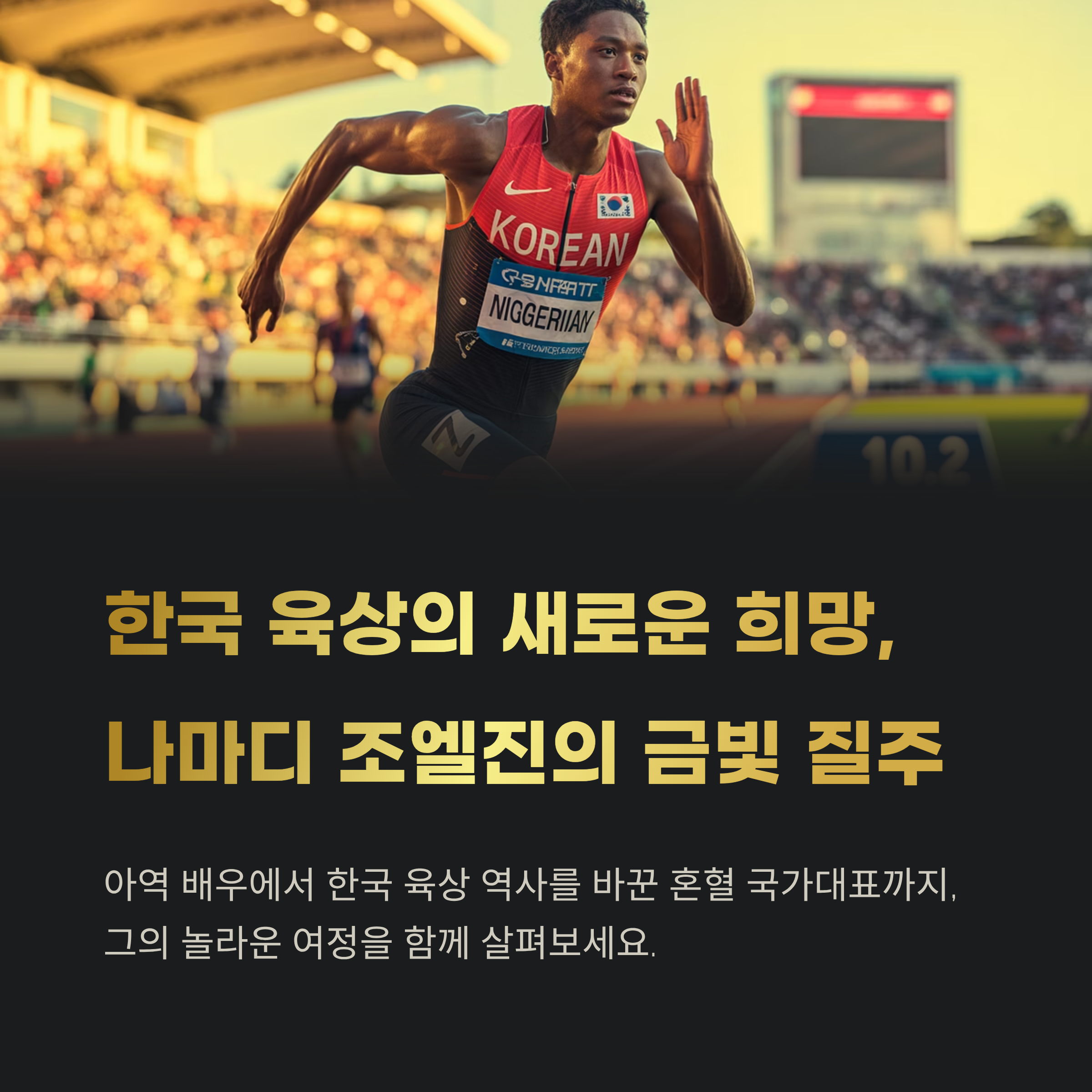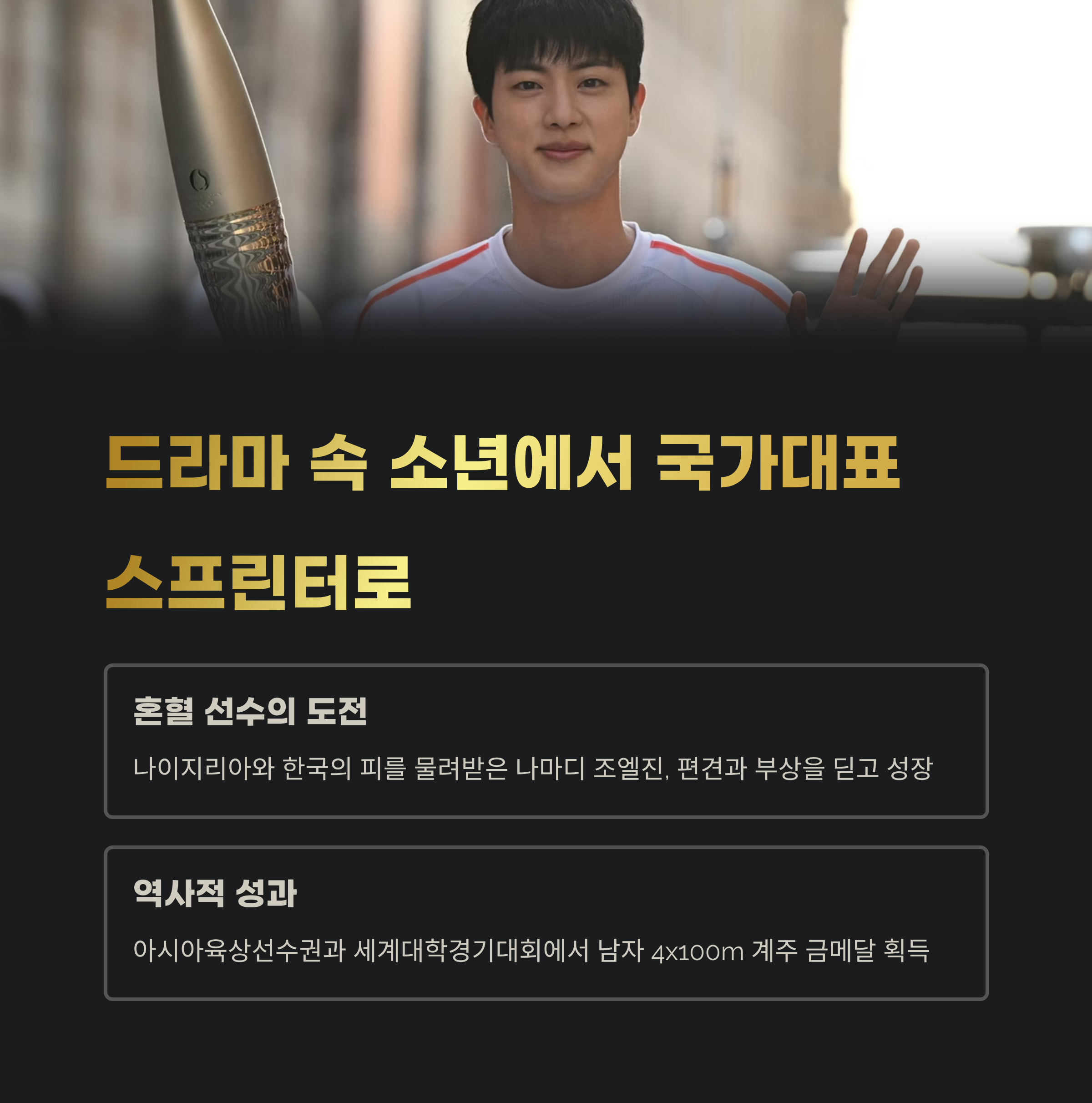 한때 드라마 속 순수한 소년이었던 아이가, 지금은 대한민국 육상 역사에 이름을 남기는 국가대표 스프린터가 됐습니다. 바로 나마디 조엘진(Joel Jin Nwamadi) 이야기입니다. 나이지리아와 한국의 피를 물려받은 혼혈 선수로서, 그는 편견과 부상, 그리고 무관심을 딛고 10초대를 달리는 단거리 스타로 성장했으며, 2025년 아시아육상선수권과 **세계대학경기대회(U대회)**에서 남자 4x100m 계주 금메달을 이끌며 대한민국 트랙에 새 역사를 썼습니다.