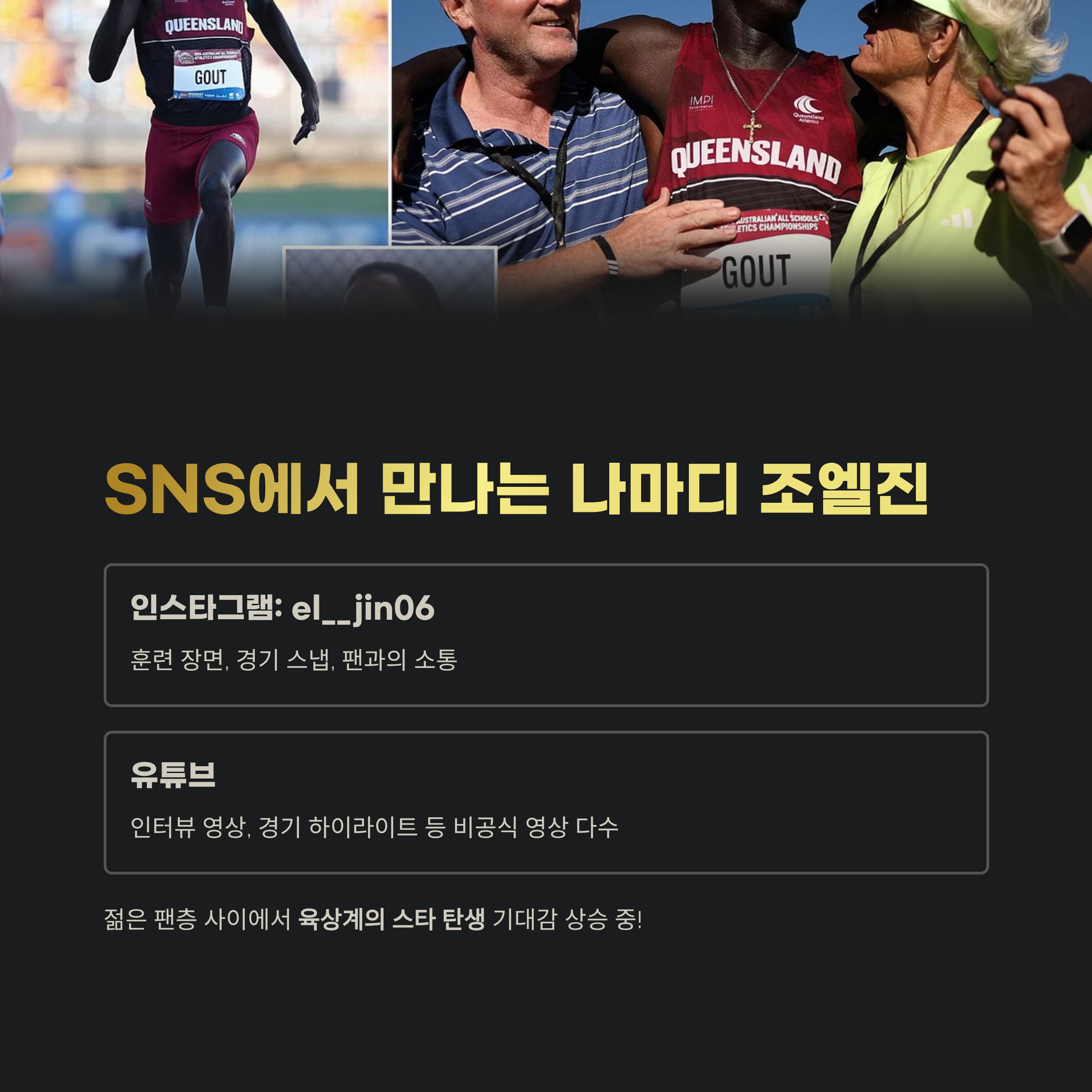 그의 인스타그램은 빠르게 팔로워가 늘고 있으며, 젊은 팬층 사이에서 육상계의 스타 탄생이라는 기대감이 커지고 있습니다.