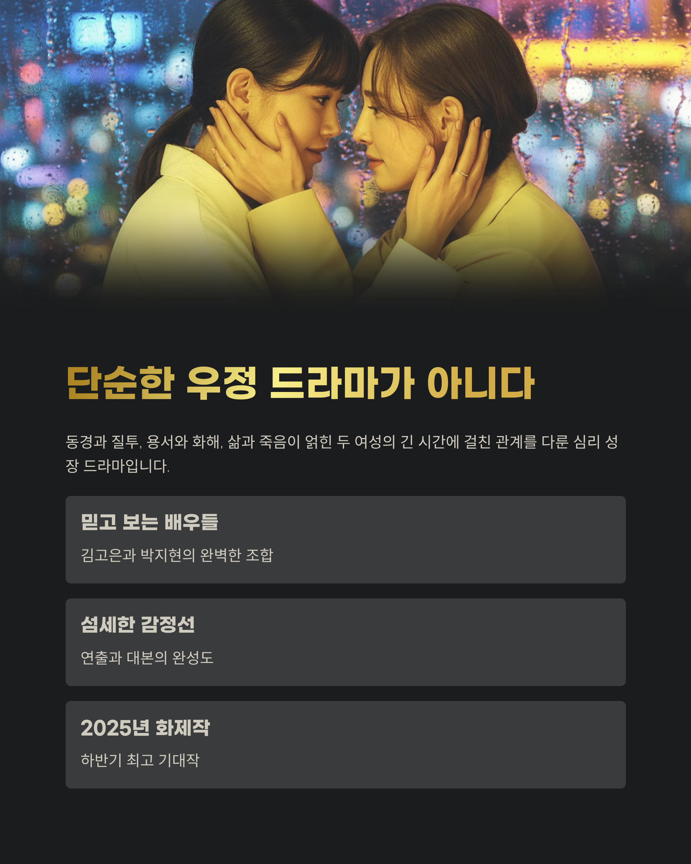 9월 넷플릭스가 선보이는 신작 드라마 **‘은중과 상연’**은 단순한 우정 드라마가 아닙니다. 동경과 질투, 용서와 화해, 삶과 죽음이 얽힌 두 여성의 긴 시간에 걸친 관계를 다룬 심리 성장 드라마입니다. 김고은과 박지현이라는 믿고 보는 배우들의 조합, 그리고 섬세한 감정선을 그리는 연출과 대본까지, 2025년 하반기 화제작으로 손꼽힙니다.