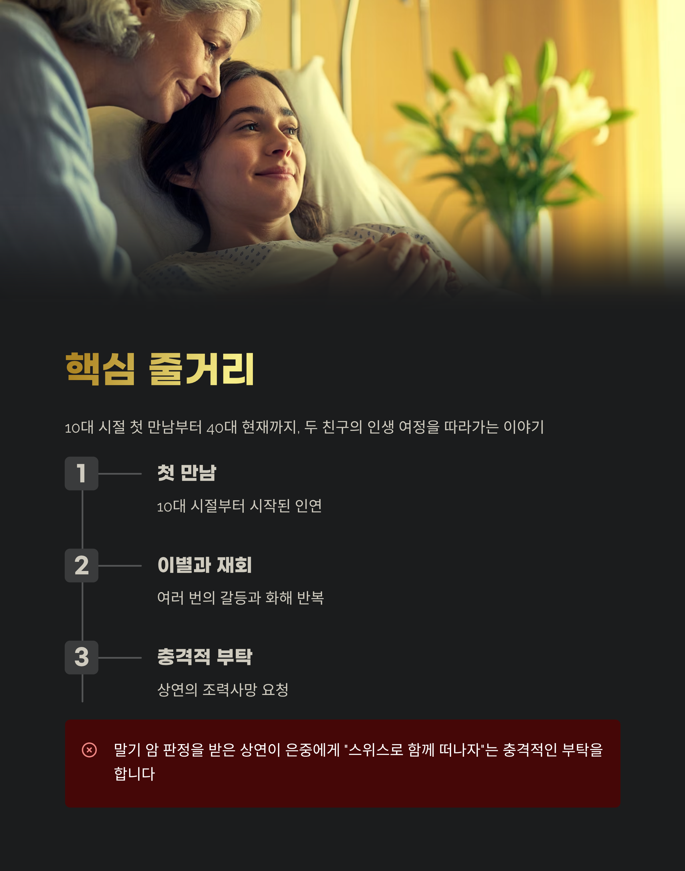 4. 40대: 말기 암이라는 충격적 상황에서 상연이 은중에게 인생 마지막 선택을 함께하자고 요청합니다.