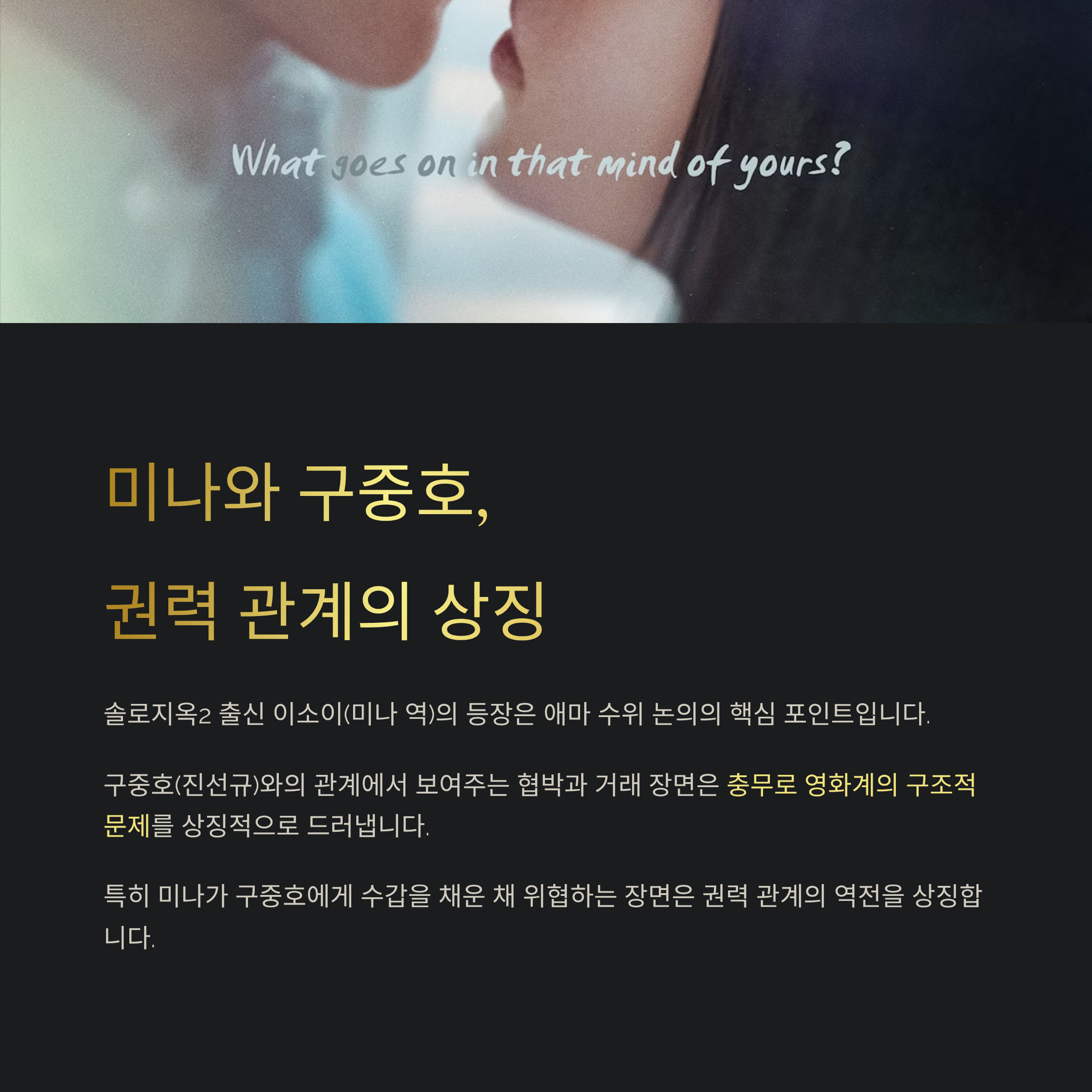 구중호(진선규)와의 관계에서 그녀가 보여주는 협박과 거래 장면은 단순한 자극을 넘어서 충무로 영화계의 구조적 문제를 상징적으로 드러냅니다. 특히 미나가 구중호에게 수갑을 채운 채 위협하는 장면은, 권력 관계의 역전이 상징적으로 묘사된 대표적인 장면이에요.