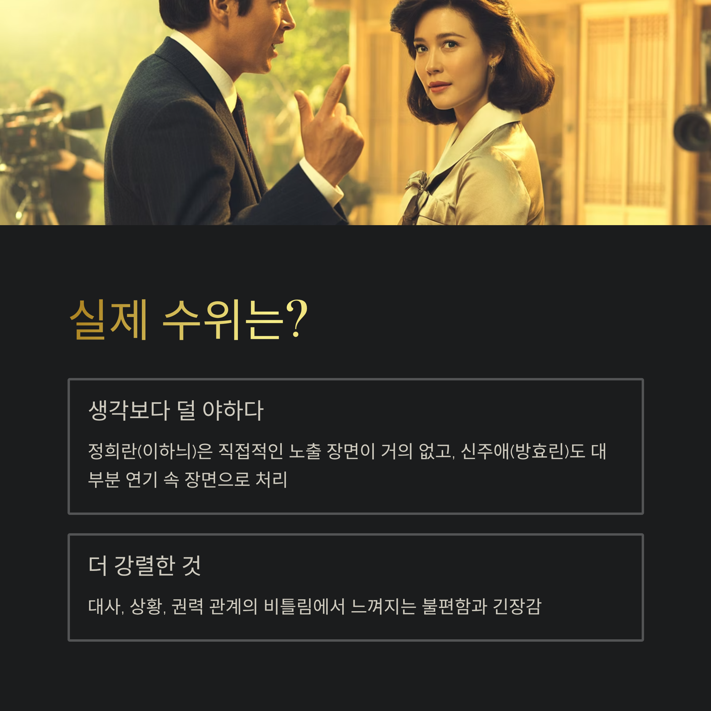 정희란(이하늬)은 직접적인 노출 장면이 거의 없고, 신주애(방효린)의 경우도 대부분 연기 속 장면으로 처리됩니다. 오히려 대사나 상황, 그리고 권력 관계의 비틀림 속에서 느껴지는 불편함이 더 강렬하죠.